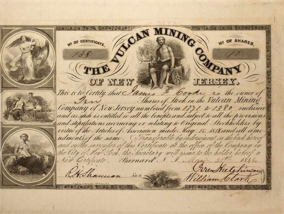 Ontonogan. Vulcan. Vulcan Mining Company of New Jersey. Issued to James F. Cooke for 10 shares, cert #138, in 1848. Signed by Orren Hutchinson and William Clark, Trustees, and R. H. Shannon Secretary. Three vignettes along left edge of allegorical women, each with different animals. Vignette at top center of a seated man with a wrap around his waist. Small vignette at center bottom of farm tools. Black border and print. U/C. Printer - Engd by J. Meignelle, NY. Measures 8 1/2" x 5". The Vulcan Mining Co is listed as obsolete in the Mines Handbook, 1918. It notes, “Operated, 1848, on War Dept. lease No. 98, in Ontonagon Co, Mich.” Lawton (1888, p. 94-98) describes two mines with the name Vulcan located in the Menominee Range. However, from his write-ups, it appears production in this district did not begin until the late 1870’s. Trimmed tight along left border. Extremely fine.
