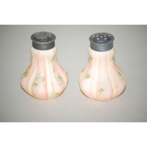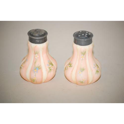 MT. WASHINGTON ART GLASS SALT & PEPPER SHAKERS - PR.<BR>2 3/4" PANELED PINK & CREAM COLORED SHAKERS W/ ENAMEL<BR>FLORAL DECORATION & SILVERPLATED LIDS-UNMARKED<BR>(ATTRIBUTED MT. WASHINGTON) - WEAR