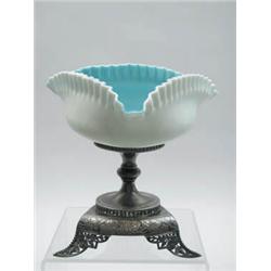 MT. WASHINGTON CASED BRIDES BOWL IN PAIRPOINT S.P. FRAME Beautiful triangular shaped Mt. Washington brides bowl in cased glass with a light blue interior and white exterior and crimped rim. The signed "PAIRPOINT" silver plated stand features a band of grape leaves and grapes with pierced legs of flowers and leaves. Base is inscribed in German and dated 1888. SIZE: Triangular bowl is 12" per side. Overall height is 11 1/2". CONDITION: Bowl is very good to excellent. The base shows some wear to silver plating. 5-66752