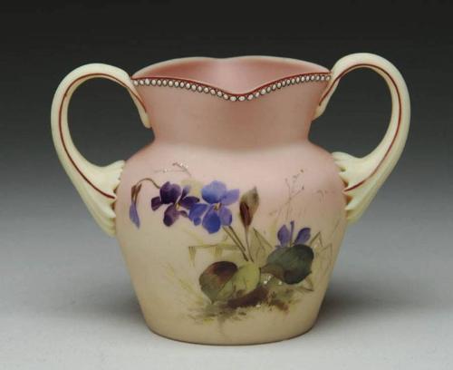 MT. WASHINGTON BURMESE DECORATED VASE. Rare two-handled vase with violet decoration and beaded top. Superb and finest coloring. Original Burmese label on underside with museum exhibition label "87-72.9". Exhibited 1987-1992 at "New Bedford Whaling Museum - Masterpieces of Mt. Washington Art Glass". PROVENANCE: Barbara St. Aubin Collection. SIZE: Overall height to top of handle is 4-1/2". CONDITION: Very good to excellent. 5-62189