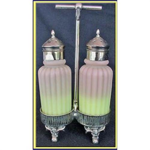 Pair of Burmese Ribbed Pillar salt & pepper shakers in original Rogers Bros silver plate stand.