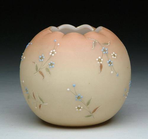 MT. WASHINGTON CROWN MILANO ROSE BOWL. Lovely Crown Milano rose bowl features a painted Burmese background with enameled decoration of blue and white flower blossoms on green and brown branches. Numbered on base "619". Pictured in the "Collectible Glass Rose Bowls" by Johanna Billings fig. 142 pg. 51. SIZE: 4 in. dia. CONDITION: Very good to excellent. Collection of Johanna and Sean Billings 5-60924