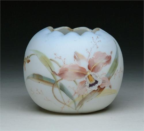 MT. WASHINGTON CROWN MILANO ROSE BOWL. White opal glass decorated with a mauve, green and brown orchid. Unsigned. Numbered on base "618". Pictured in the "Collectible Glass Rose Bowls" by Johanna Billings fig. 136 pg. 50. SIZE: 4-3/4 in. dia. CONDITION: Very good to excellent. Collection of Johanna and Sean Billings 5-60933