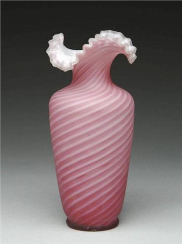 MT. WASHINGTON SATIN SWIRL VASE. This ruffle top vase with white and pink peppermint swirl decoration with a flat satin finish. SIZE: 10" t. CONDITION: Generally very good to excellent. 5-62210