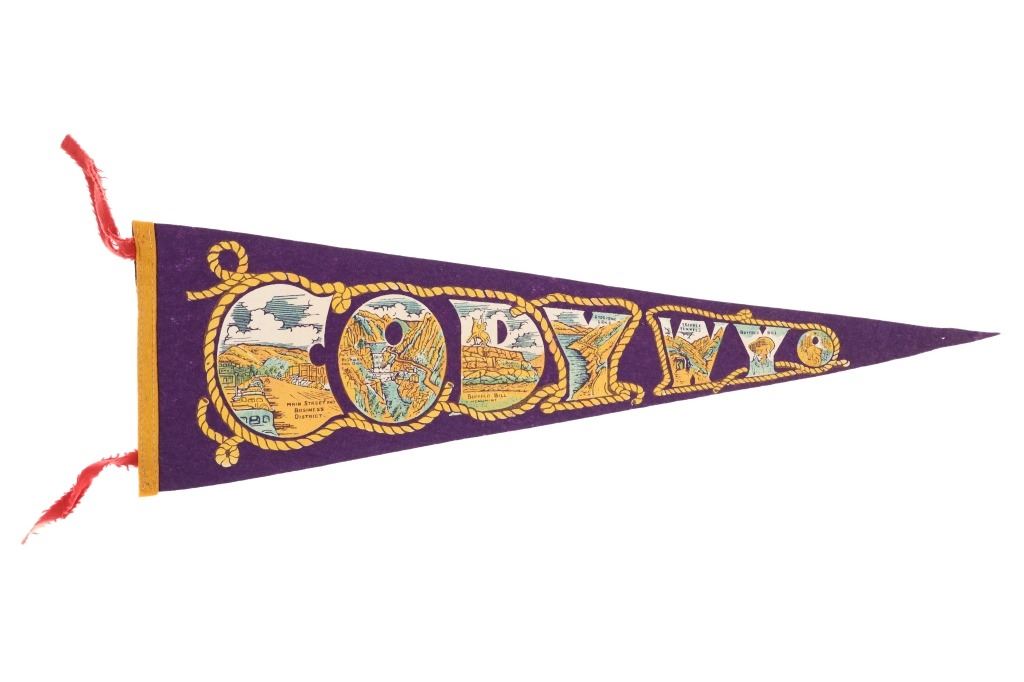 For your consideration are 14 vintage Montana, Wyoming and Yellowstone Park felt pennant flags circa 1950s-70s. The collection shows many different sized and colored pennant flags from locations around Montana, Wyoming and Yellowstone National Park. There are four Landusky, Montana pennant flags of various colors, a Cheyenne, Wyoming flag, a Sheridan, Wyoming flag, a Cody, Wyoming flag and seven Yellowstone National Park flags with various colors, sizes and graphics. All pennant flags show good condition overall with the largest Yellowstone flag exhibiting some smaller holes, but no signs of major damage are noted. The flags measure from 11 3/4" L x 5" W to 29" L x 11 1/4" W