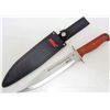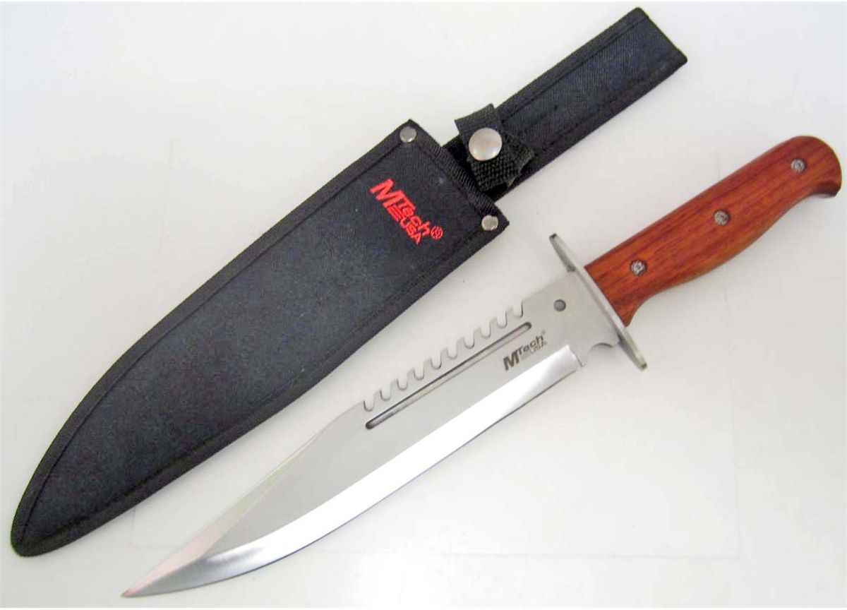 15" overall. 9 1/2" 440 stainless sawback blade. Full tang. Brown wood handles with stainless finger guard. Black nylon belt sheath