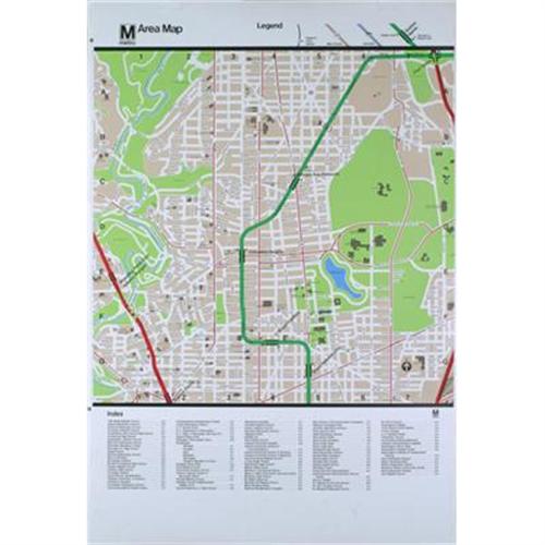 NOTES:Washington Metropolitan Area Transit Authority The bottom part of the map includes a legend of all the streets, avenues and sights. Translucent Versions were screen printed with semi-transparent inks on a material called 'transparent opaline' which is like a transparent styrene but stronger. The opaque paper versions were screen printed on a heavyweight paper cover stock and also UV clearcoated. Very bright and with every thing you need to know about Washington DC. The one-of-a-kind map measures 48 1/2 x 33 1/4 inches. Very bright and with every thing you need to know about one area in Washington DC. The one-of-a-kind map measures 48 1/2 x 33 1/4 inches. The bottom part of the map includes a legend of all the streets, avenues and sights.