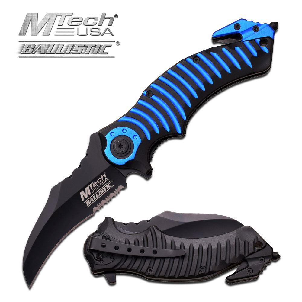 MTECH 8.25" BLUE AND BLACK S/A RESCUE KNIFE **|**|** INCLUDES CARBIDE GLASS BREAKER, POCKET CLIP, AND SEATBELT CUTTER