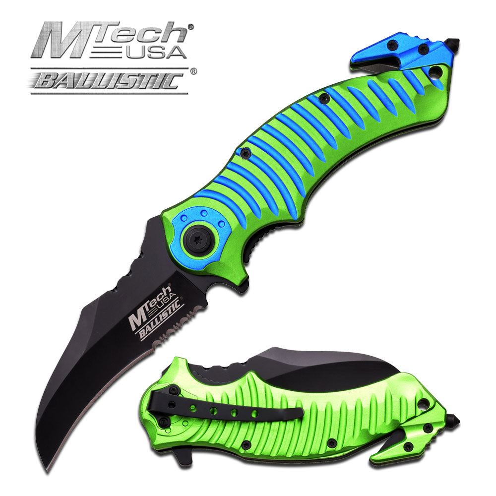 MTECH 8.25" GREEN AND BLUE S/A RESCUE KNIFE **|**|** INCLUDES CARBIDE GLASS BREAKER, POCKET CLIP, AND SEATBELT CUTTER