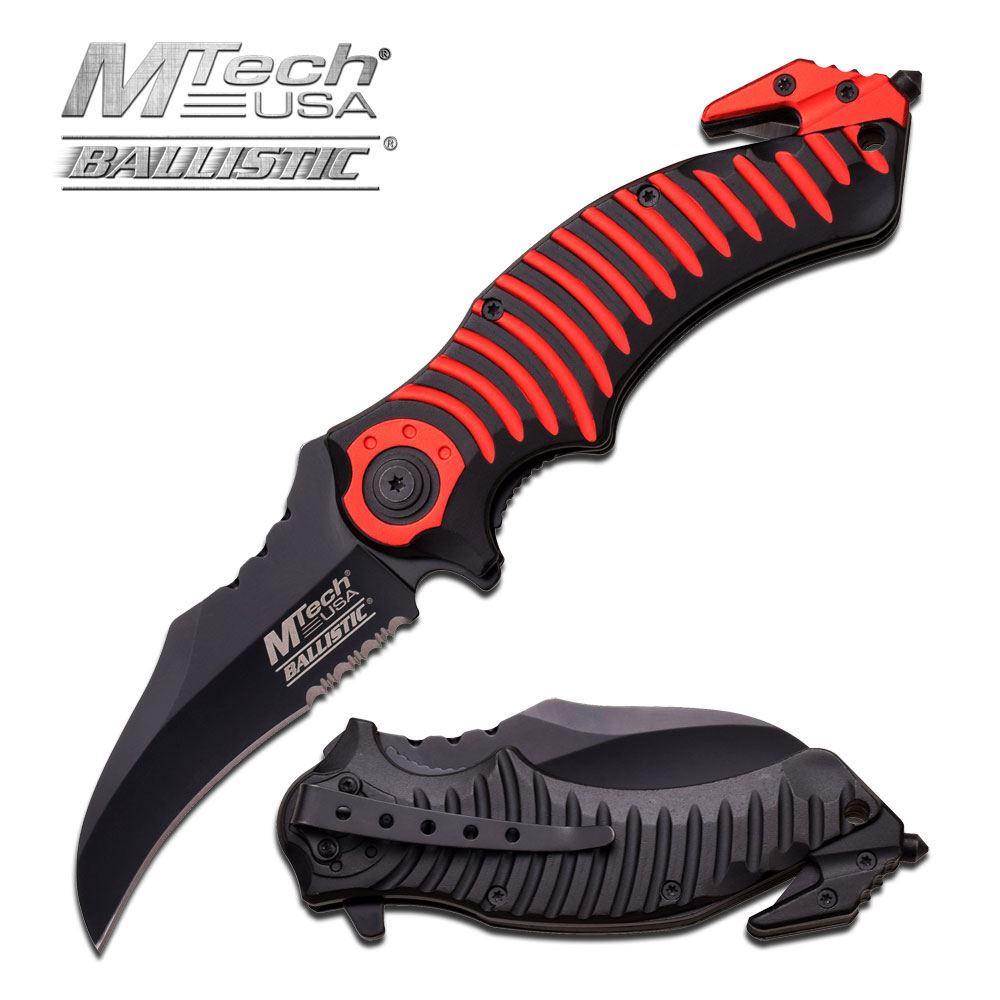 MTECH 8.25" RED AND BLACK S/A RESCUE KNIFE **|**|** INCLUDES CARBIDE GLASS BREAKER, POCKET CLIP, AND SEATBELT CUTTER