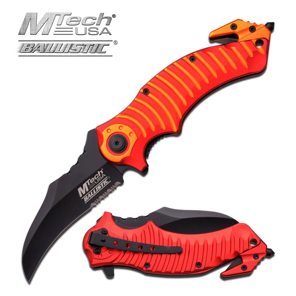 MTECH 8.25" RED AND ORANGE S/A RESCUE KNIFE **|**|** INCLUDES CARBIDE GLASS BREAKER, POCKET CLIP, AND SEATBELT CUTTER