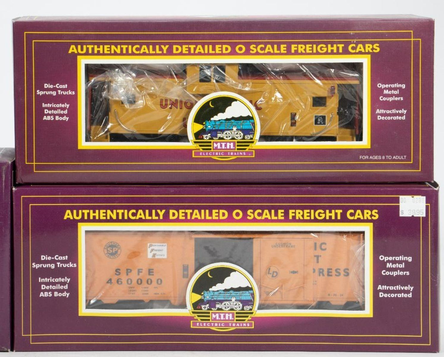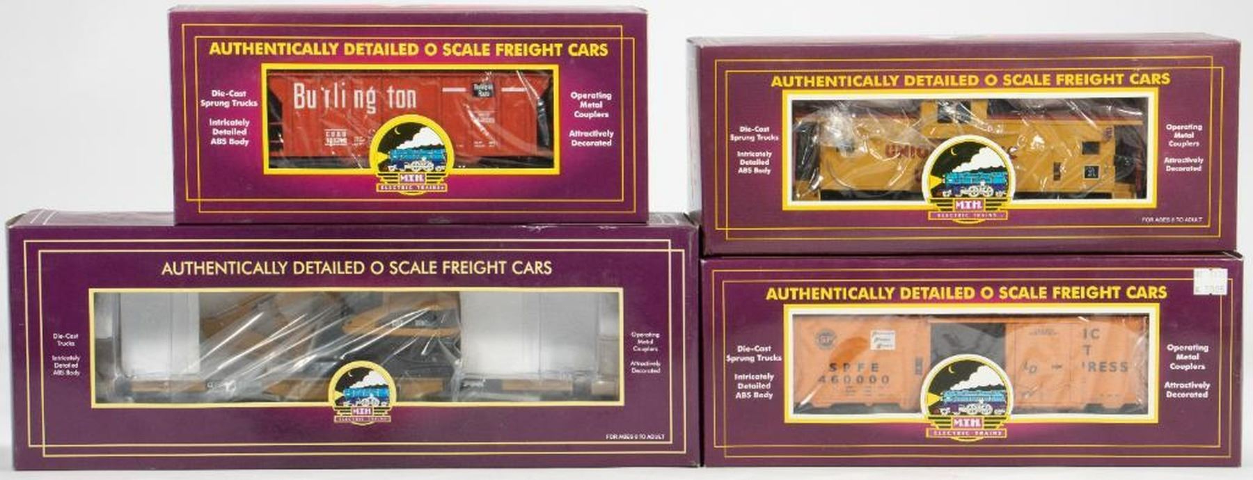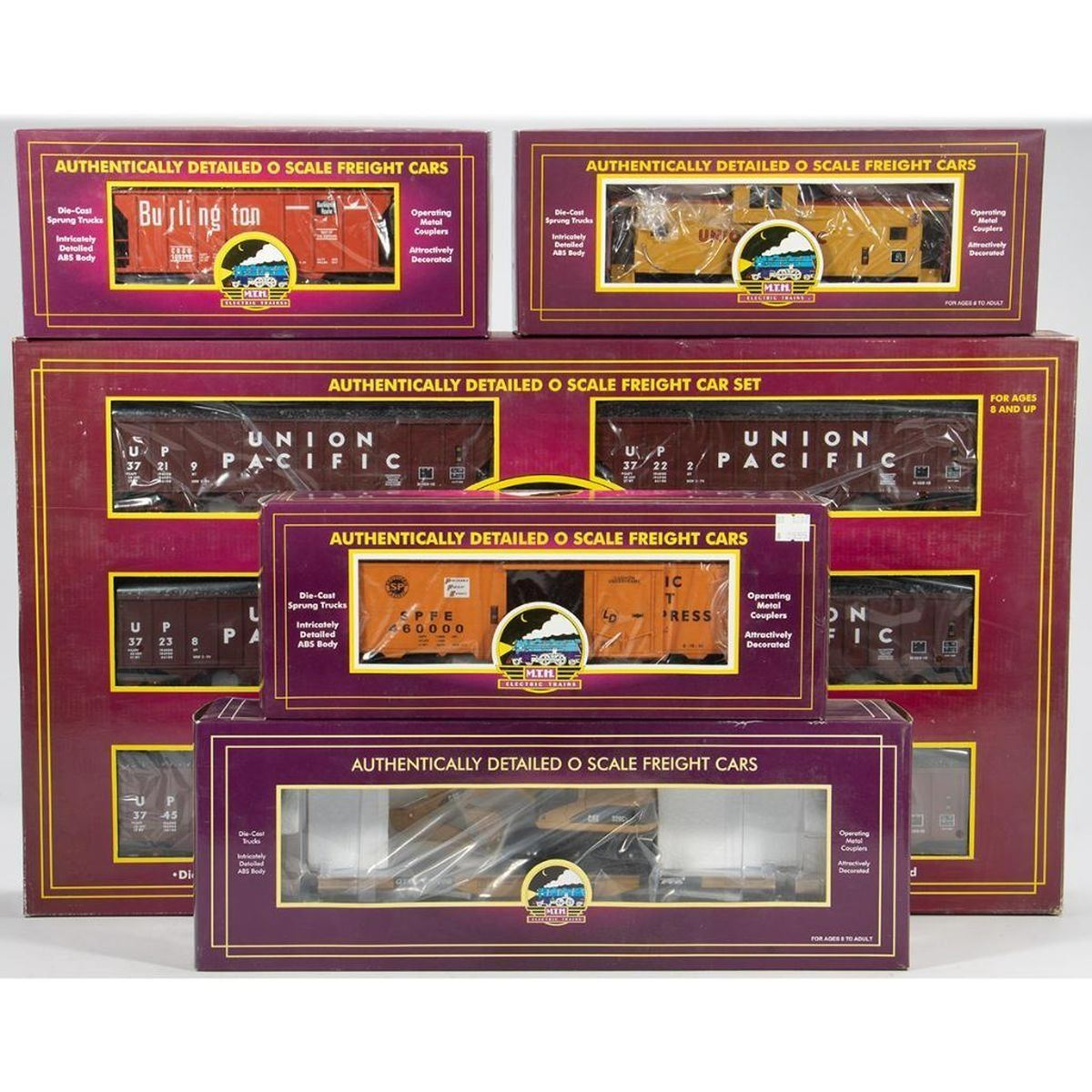 MTH Freight Cars: 20-98424 TTX (#131008) 47' Heavy Duty Flat Car with CAT 320C Excavator 20-91013 Union Pacific Extended Vision Caboose 20-94007 Southern Pacific Reefer Car 20-97105 Burlington PS-2 Hopper 20-97059 Union Pacific 4-Bay Hopper with Coal (6 Car Set) All in original boxes