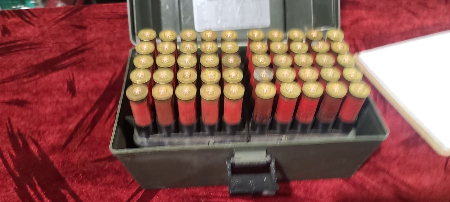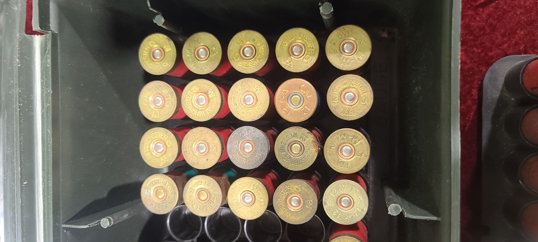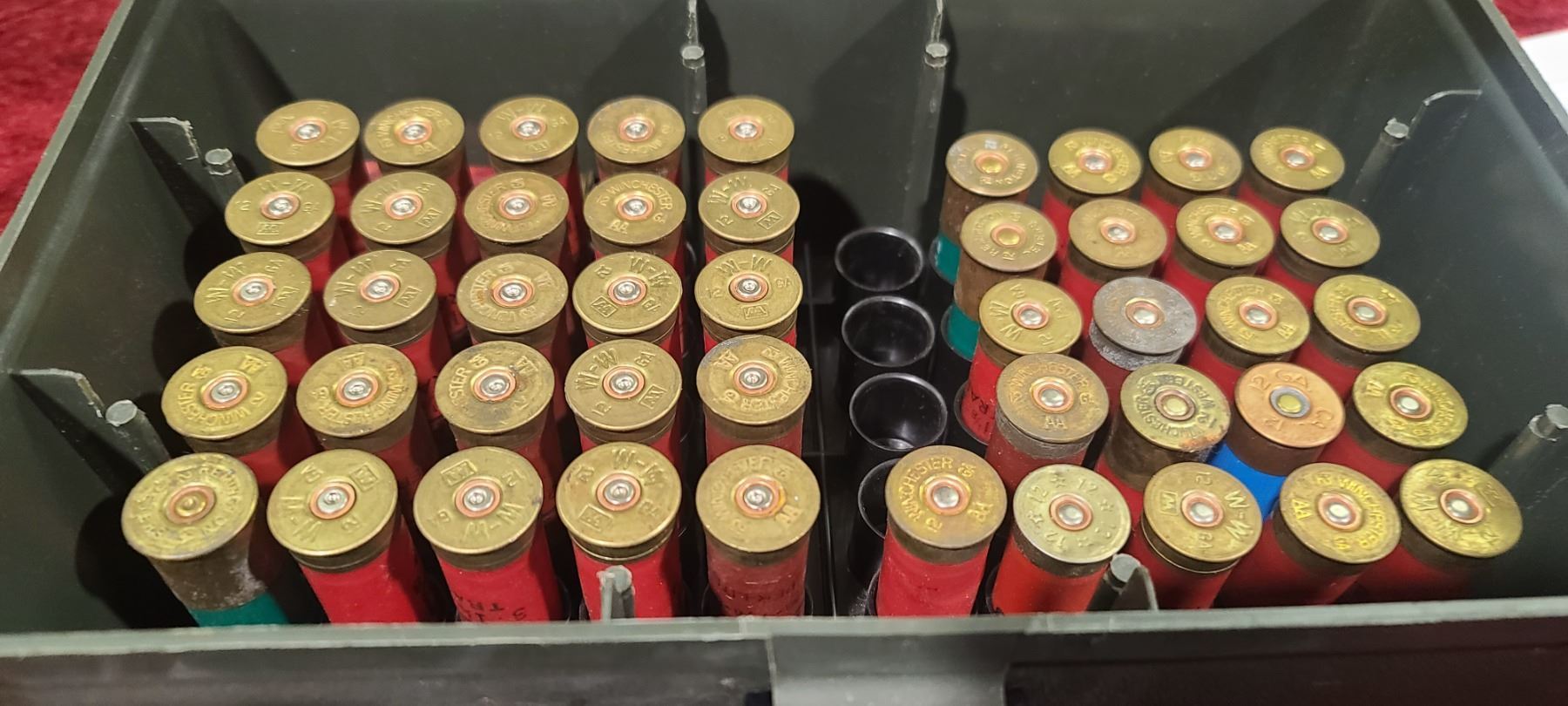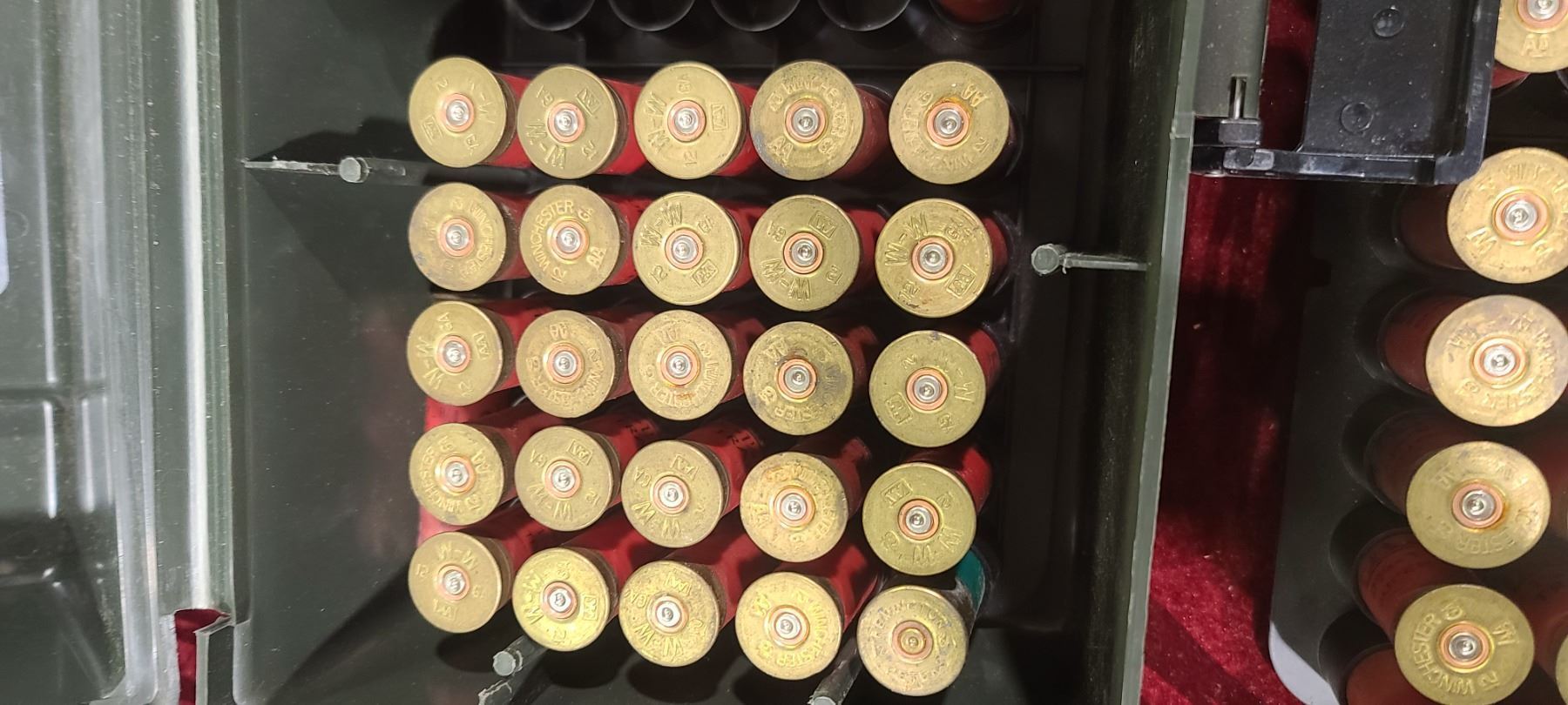 MTM CASE CARD WITH 26 ROUNDS OF 12GA TRAP - AND 73 SPENT SHELLS - CASE CAN HOLD 100 SHELLS