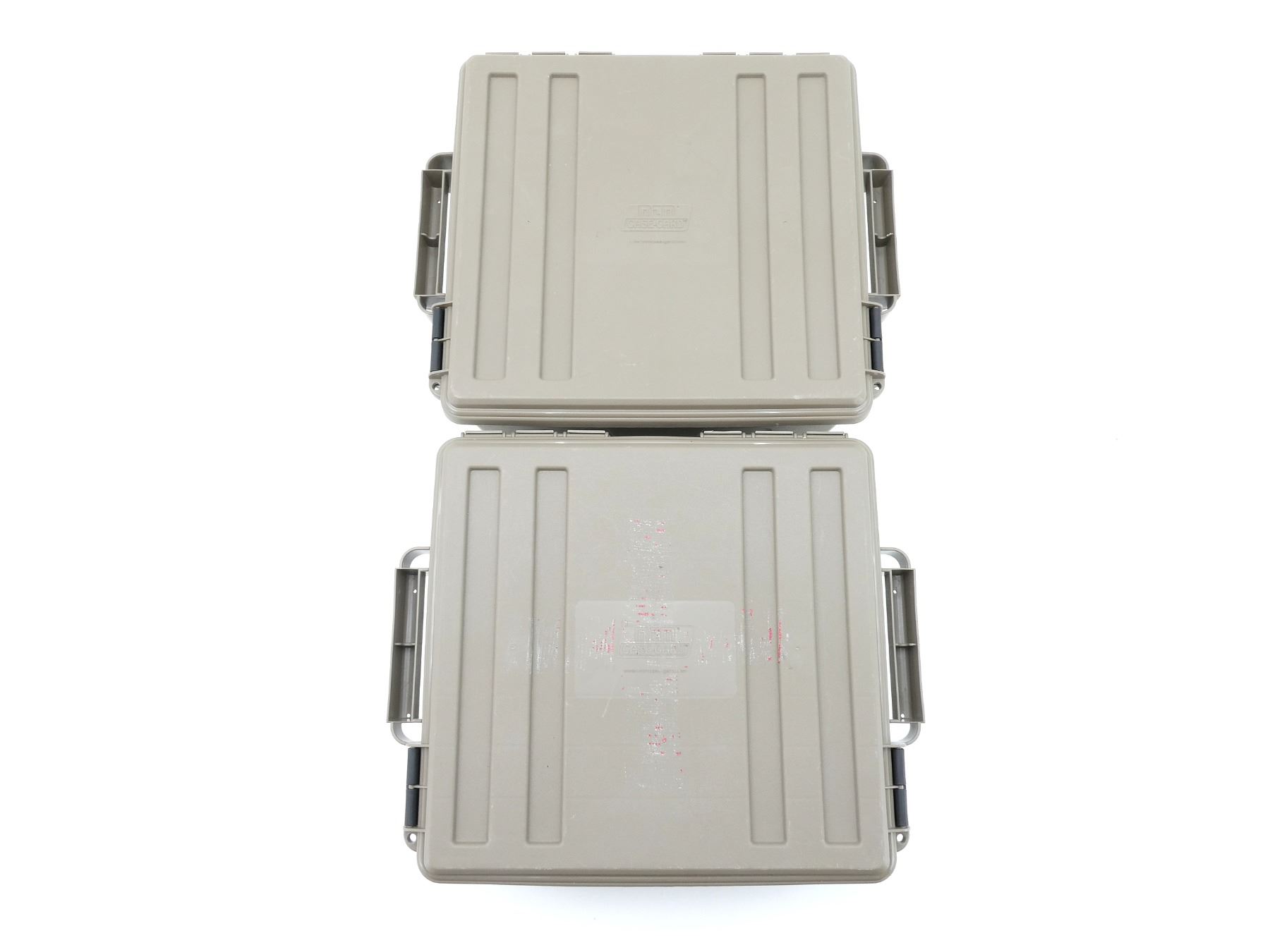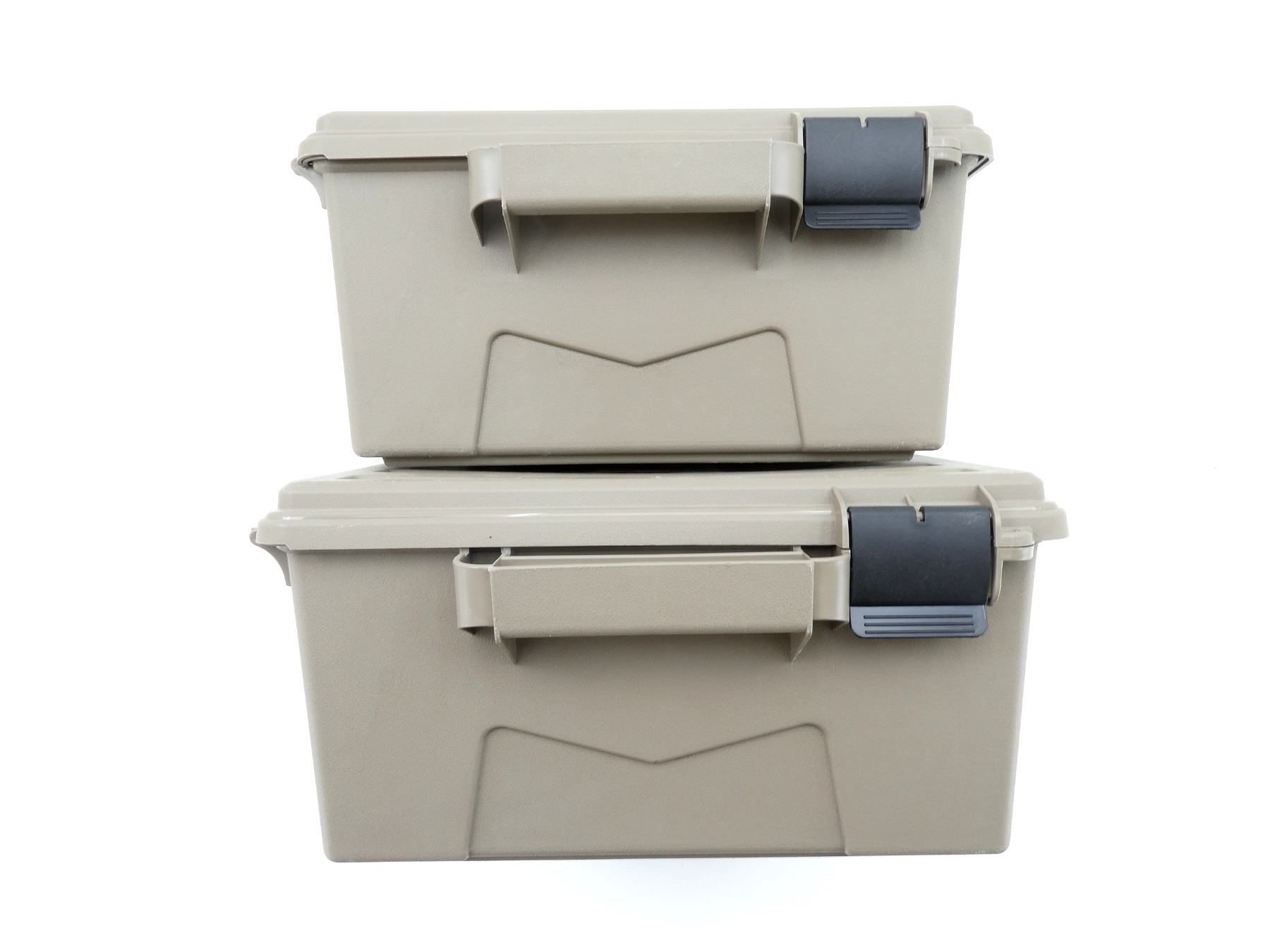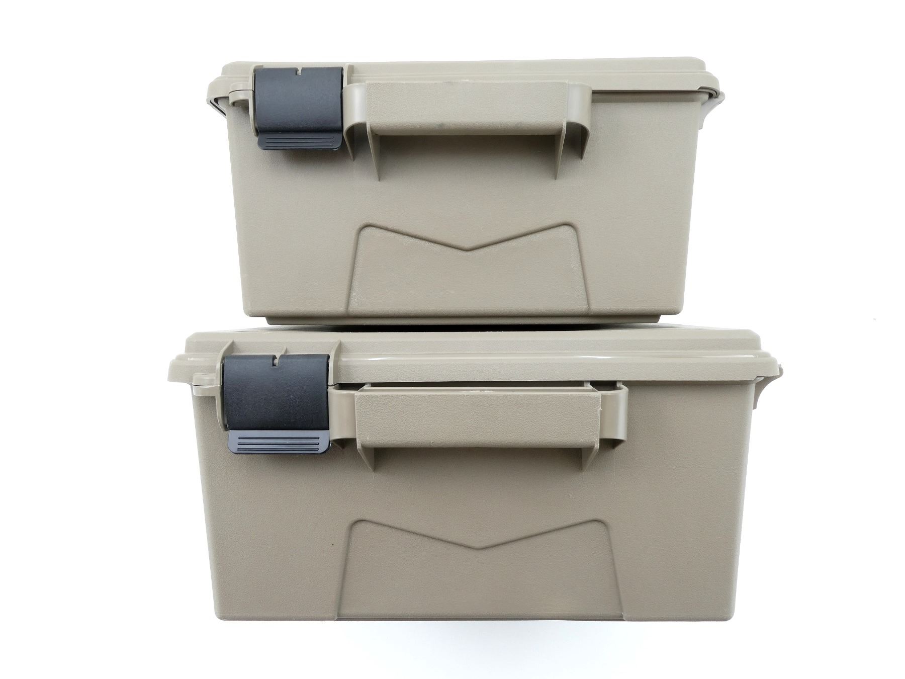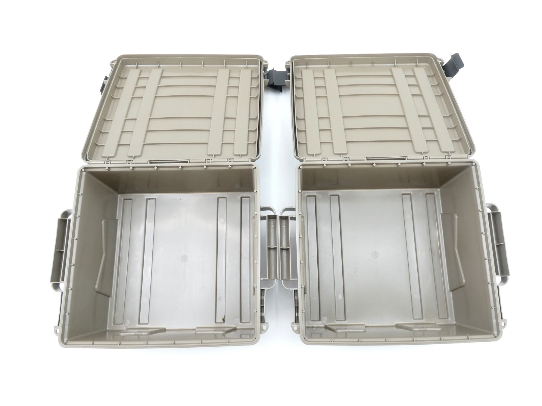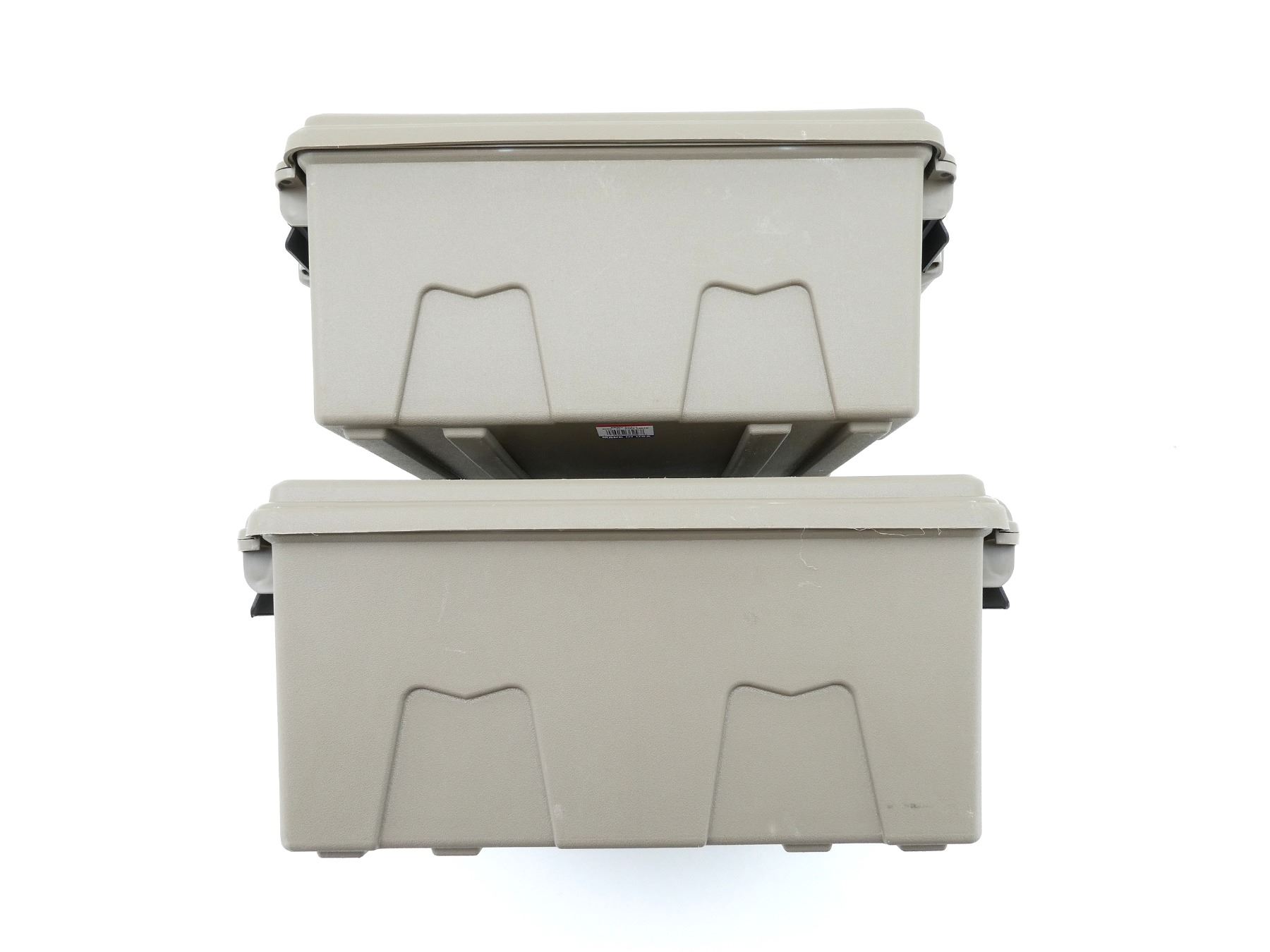 LOT INCLUDES; (2) TAN POLYMER DRY AMMO / STORAGE BOXES, WITH CARRY HANDLES & LATCHES, MARKED: "MTM CASE-GARD", ETC. OVERALL LENGTH APPROX. 19" X 16" X 8". SEE PHOTOS.