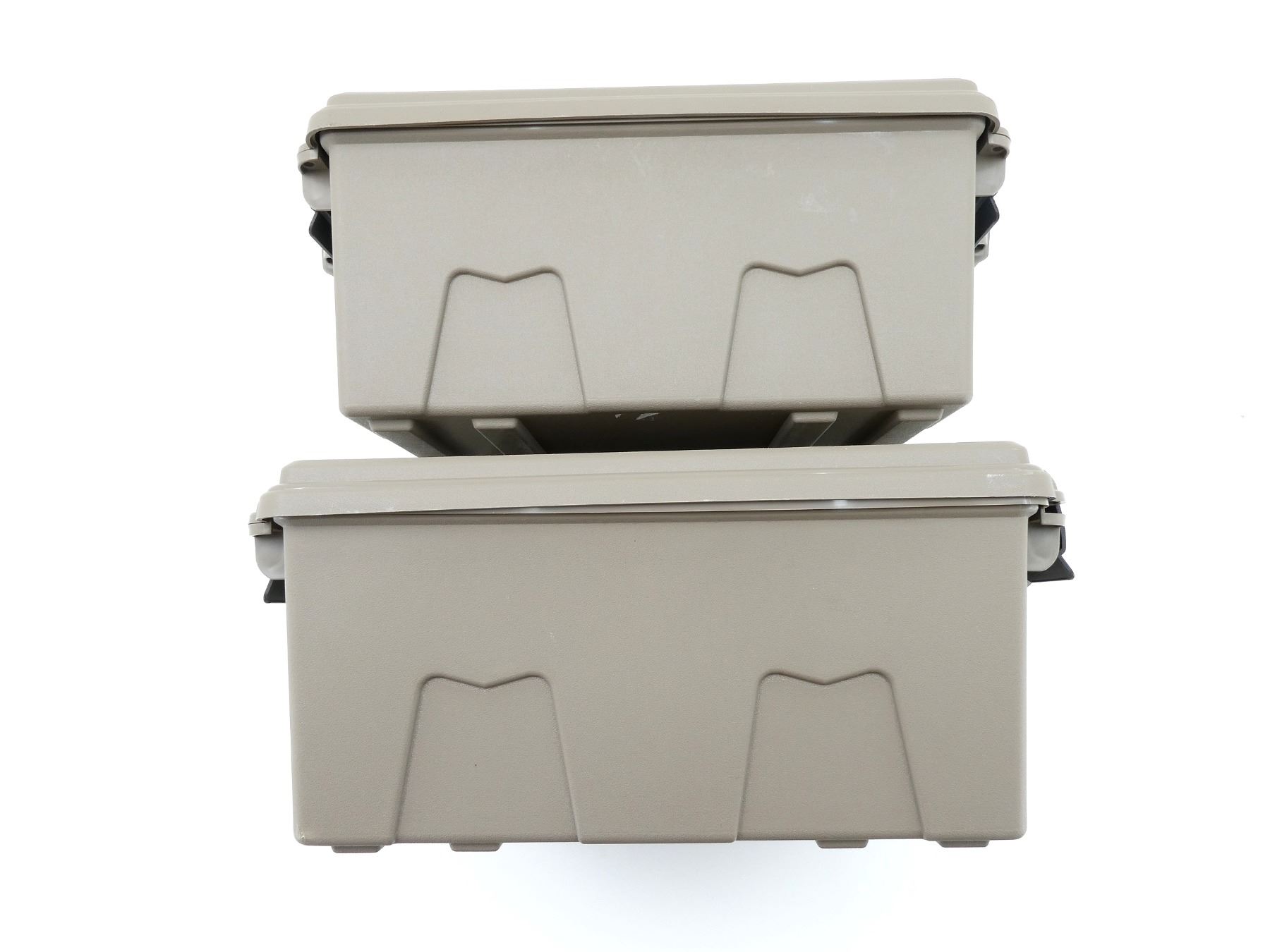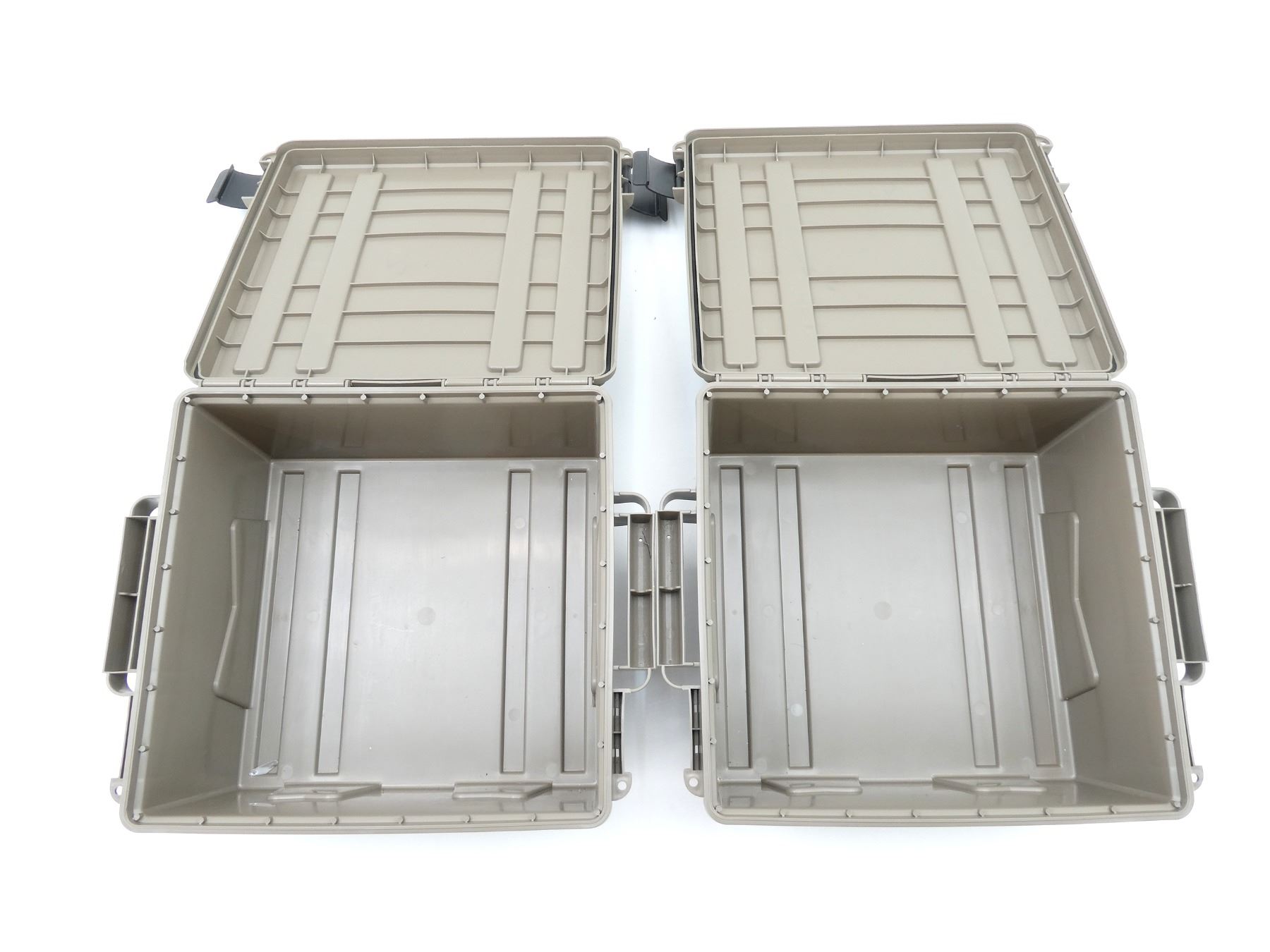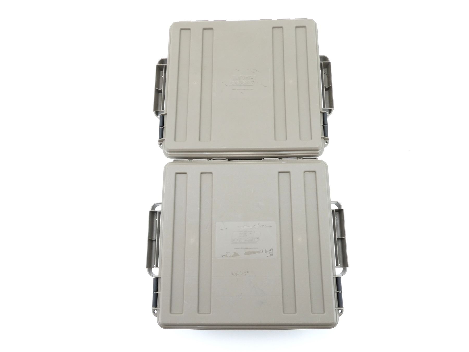 LOT INCLUDES; (2) TAN POLYMER DRY AMMO / STORAGE BOXES, WITH CARRY HANDLES & LATCHES, MARKED: "MTM CASE-GARD", ETC. OVERALL LENGTH APPROX. 19" X 16" X 8". SEE PHOTOS.