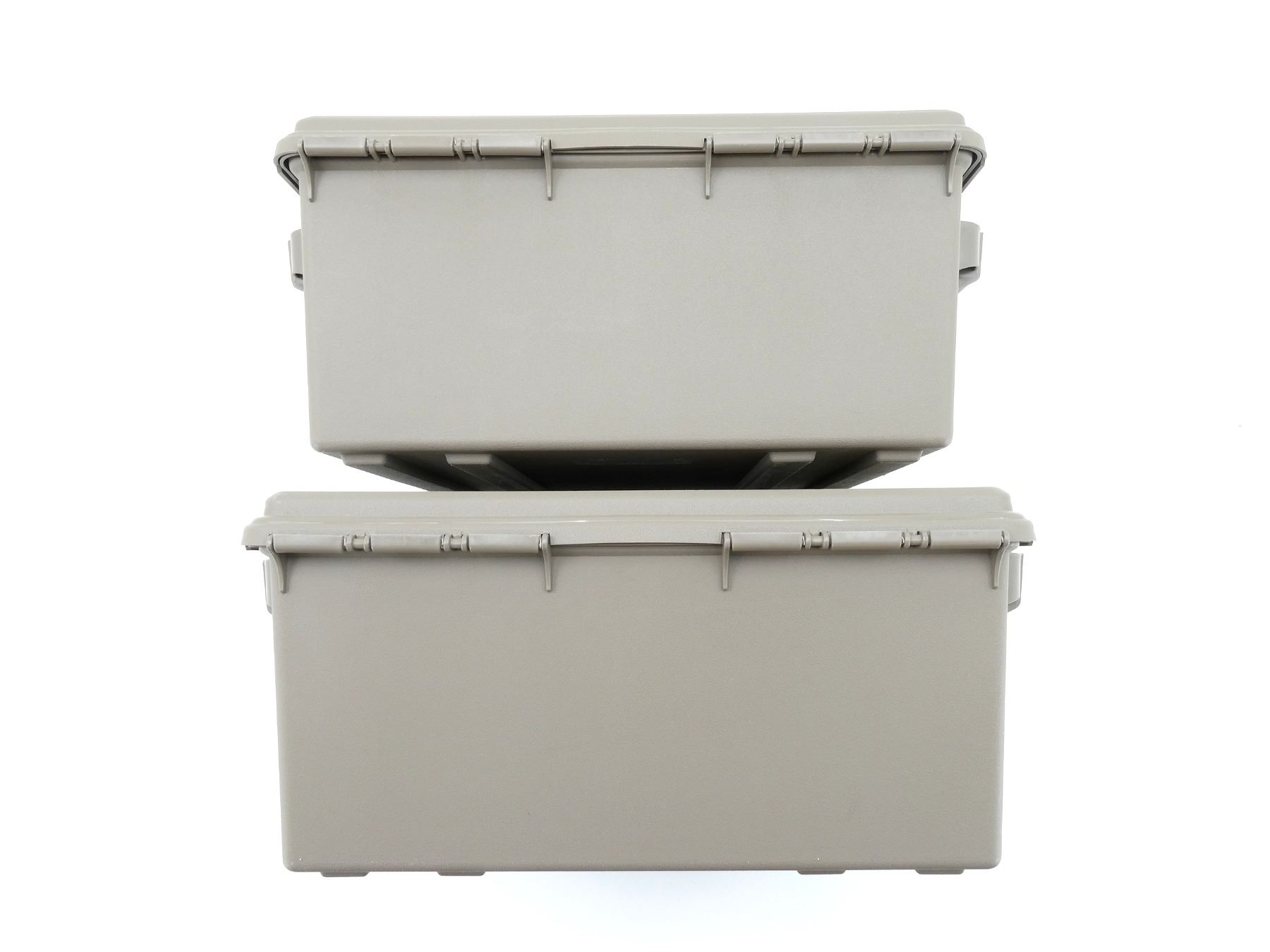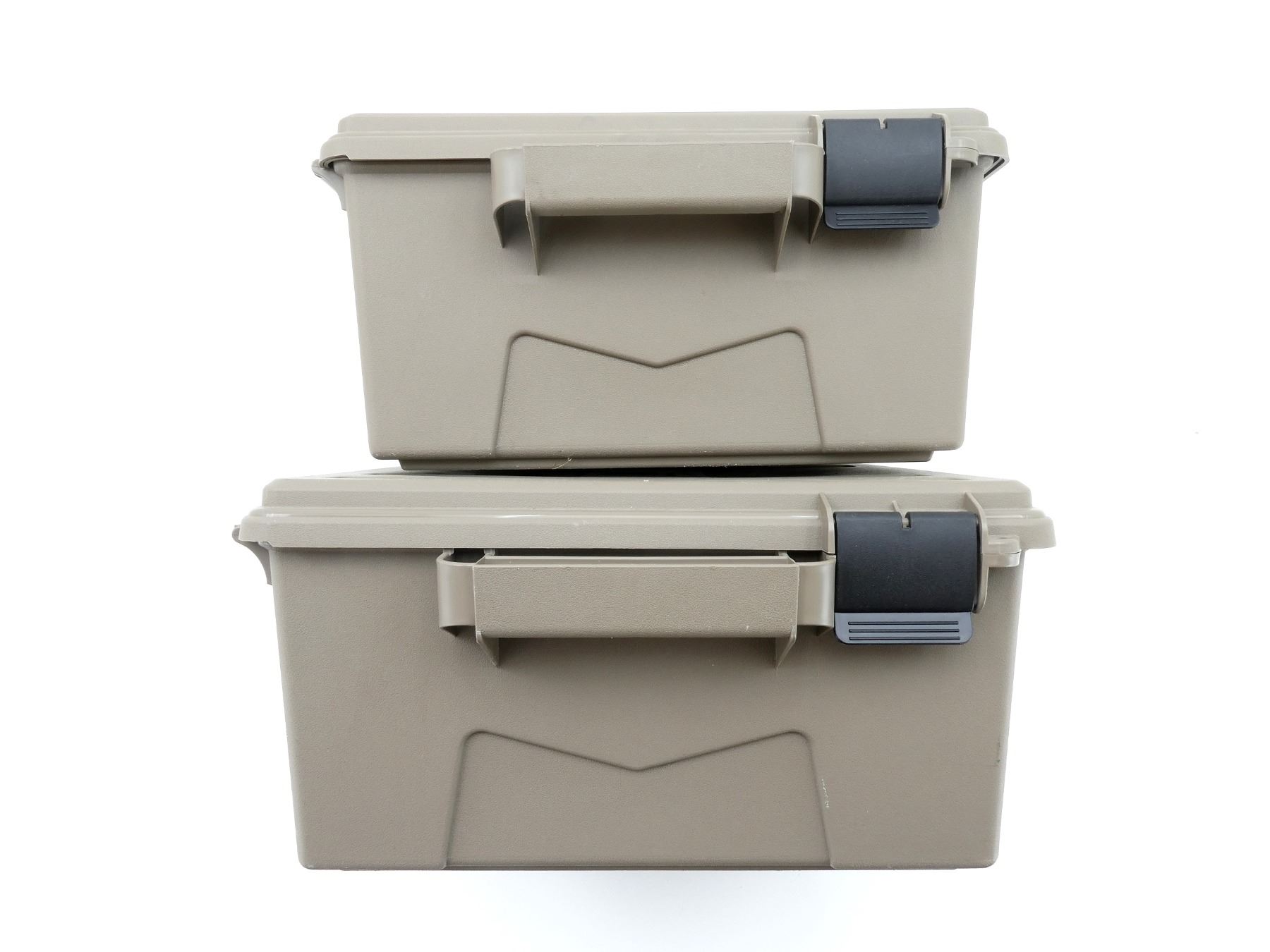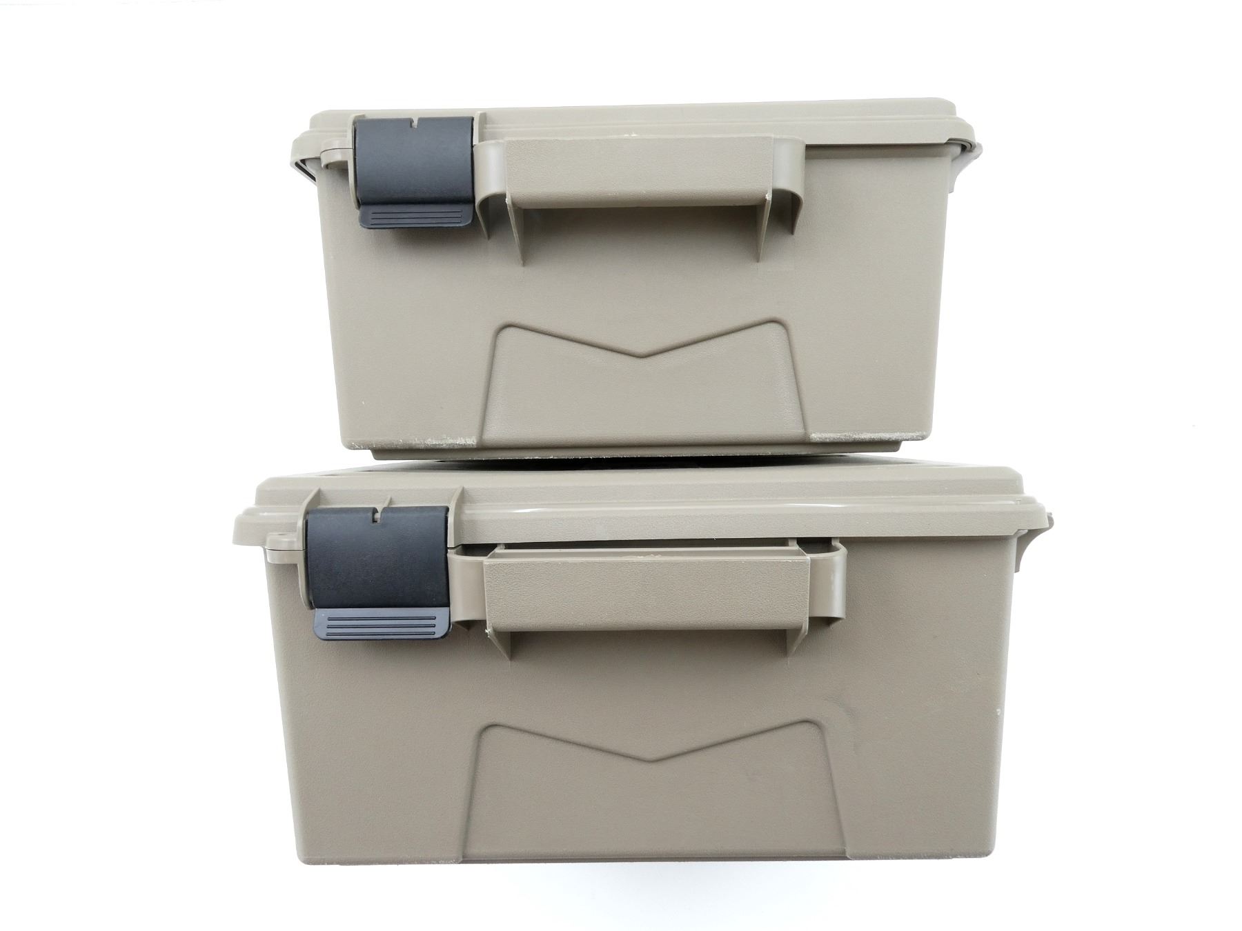 LOT INCLUDES; (2) TAN POLYMER DRY AMMO / STORAGE BOXES, WITH CARRY HANDLES & LATCHES, MARKED: "MTM CASE-GARD", ETC. OVERALL LENGTH APPROX. 19" X 16" X 8". SEE PHOTOS.