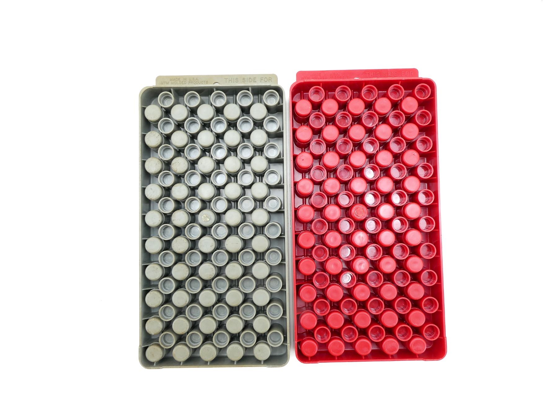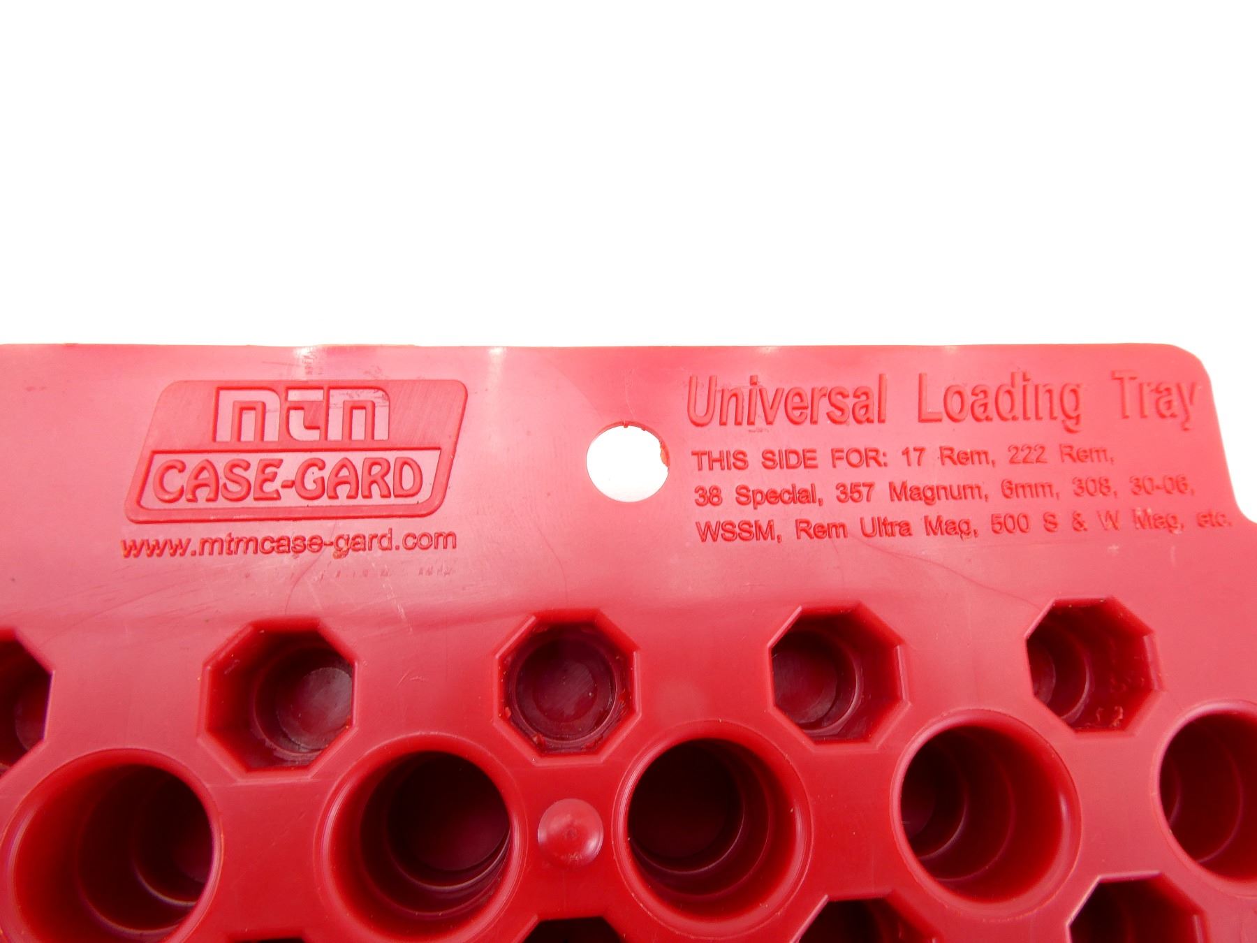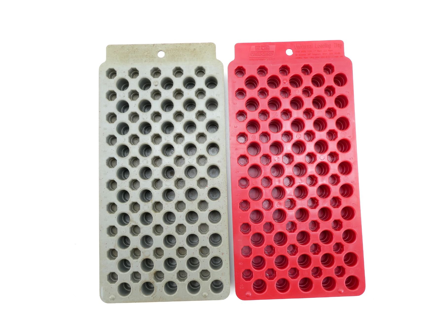 LOT INCLUDES; (2) MTM CASE-GARD RED / GREY PLASTIC TRI-UNIVERSAL LOADING TRAYS, HOLD 150 RNDS, FITS VARIOUS CALIBERS. SEE PHOTOS.