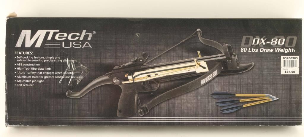 DX-80 ABS construction with fiberglass limb, adjustable pin sight and bolt retainer. 80 lbs draw weight. Good condition, in original box.