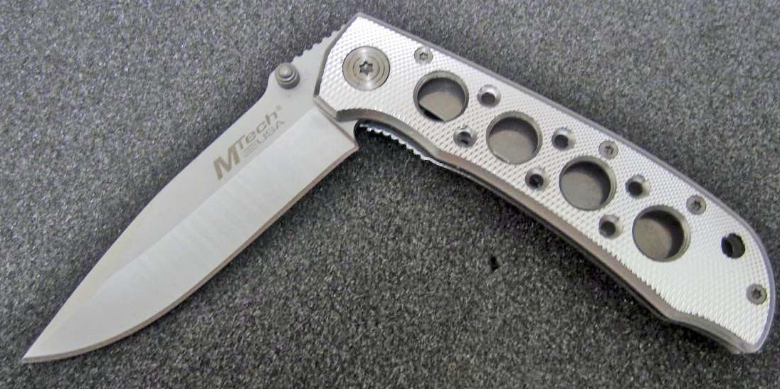 4 1/8" closed. 440 stainless blade with bead blast finish and ambidextrous thumb studs. Silver aluminum handles with a diamond cut finish. Stainless pocket clip.