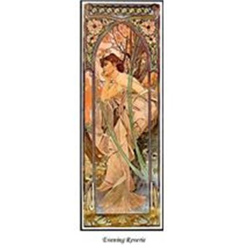 Original Art Nouveau poster "EVENING REVERIE" was created in 1899 as a part of the series "The Times of the Day". This full size 25 years old "Out of Print" reproduction poster is in MINT condition, ornamental arch decor is applied with gold by Silkscreen process. Mucha signature in lower right corner. Translation of the Czech text in the margin : Printed in 1981 by Javoz Jablonec n N in the edition of 3000. Author A.. Mucha from the series The Times of the Day. Size : 35.25" x 12.75". Printed in Czechoslovakia. THIS IS LARGE FULL SIZE poster - not "oversize POSTCARD" print!!!!! The name of the pictured poster in the white margin is not part of the actual poster. Other 3 posters from this suite are also available individualy or as complete set of 4, see picture #2.