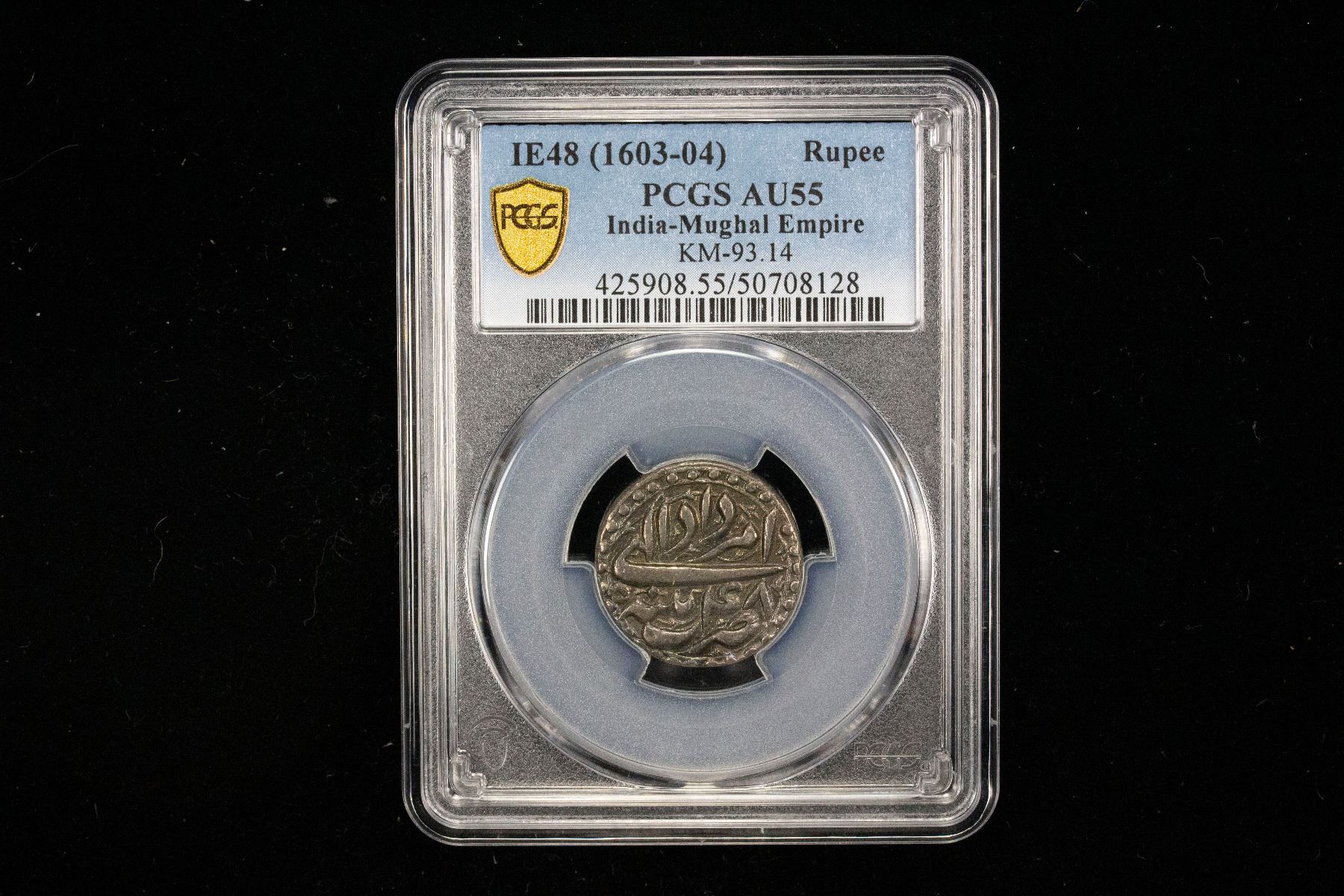 MUGHAL: Akbar, 1556-1605, AR rupee, Patna, Ilahi 48, Amardad, KM-93.14, attractive toning, PCGS graded AU55, ex Hakim Hamidi