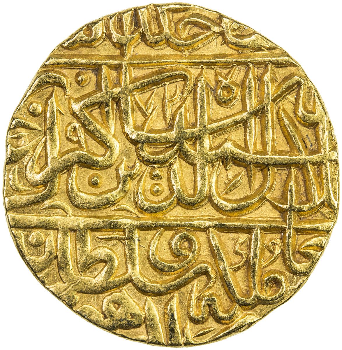 MUGHAL: Akbar I, 1556-1605, AV mohur (10.93g), Lahore, AH972, KM-106.4var, Lid-G4, reverse in double foliated pentafoil, superb bold strike, with full mint name & date, About Unc, RR. Liddle lists this version, with double pentafoil, for 971 and 973-976, so this coin fills in the previously unreported year.