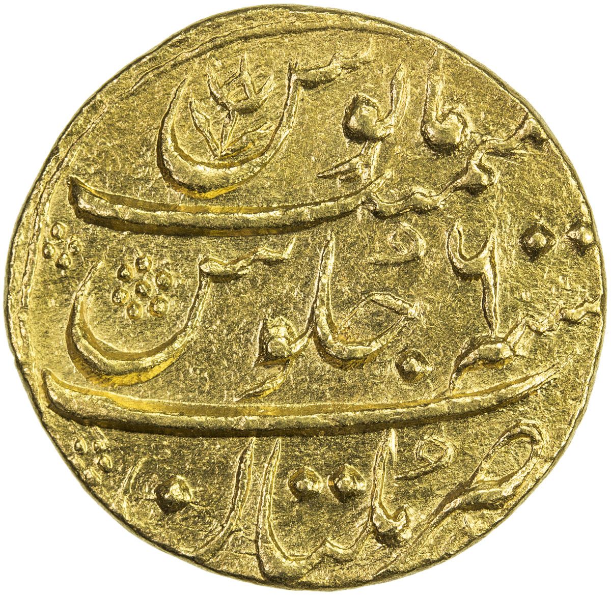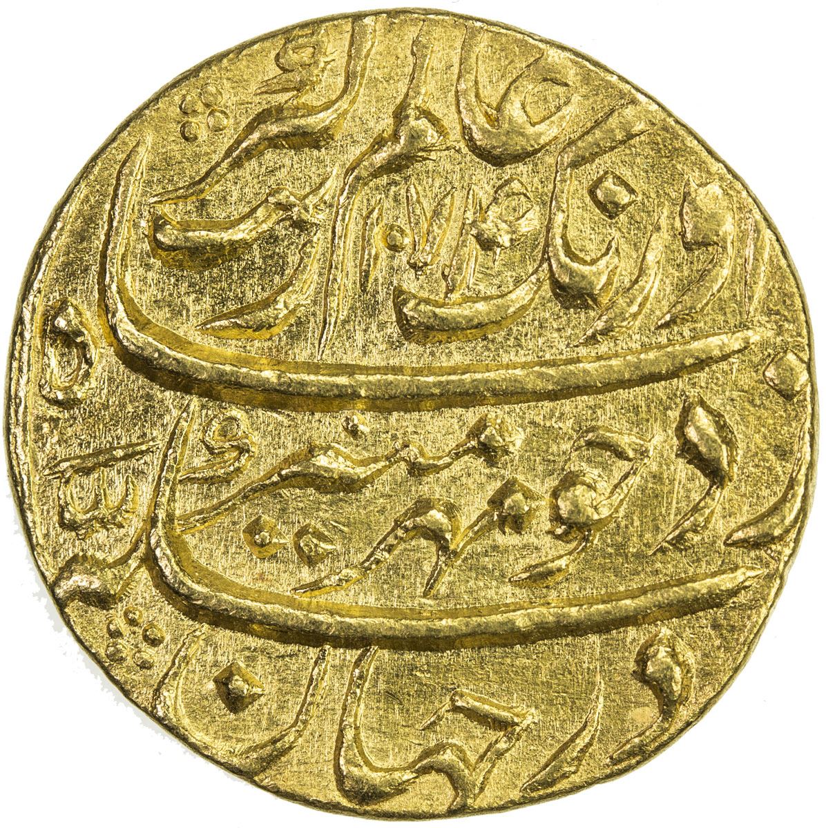 MUGHAL: Aurangzeb, 1658-1707, AV mohur (10.92g), Multan, AH1074 year 6, KM-315.36, 4/3 overdate, Unc. While the geographical area of the Empire reached its zenith under Aurangzeb, his costly military endeavors destabilized the prosperity of the kingdom, and the resulting rebellion and dissension caused the decline of the Empire in succeeding reigns.