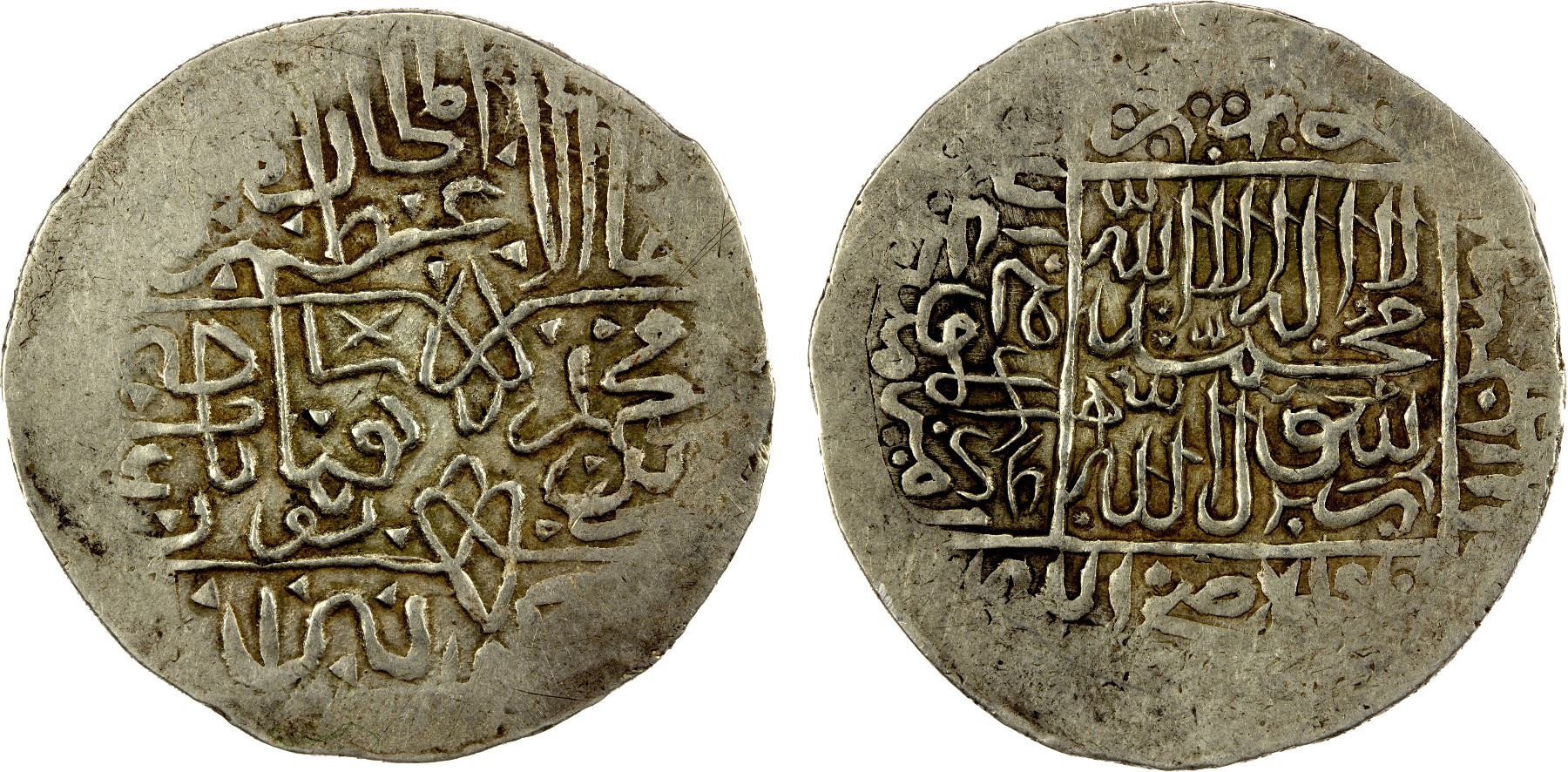MUGHAL: Humayun, 1530-1556, AR shahrukhi (4.74g), mint uncertain, B-B2464, unusual type, with the reverse bearing the kalima in a square and the names and titles of the Rashidun in the margin; the style strongly suggests that this types was struck at Badakhshan but the date is unknown (possibly undated), EF, RRR. This is the third reported example, the others Zeno-82510 (for further information) and 284405, all from the same pair of dies. This example is the finest of the three.