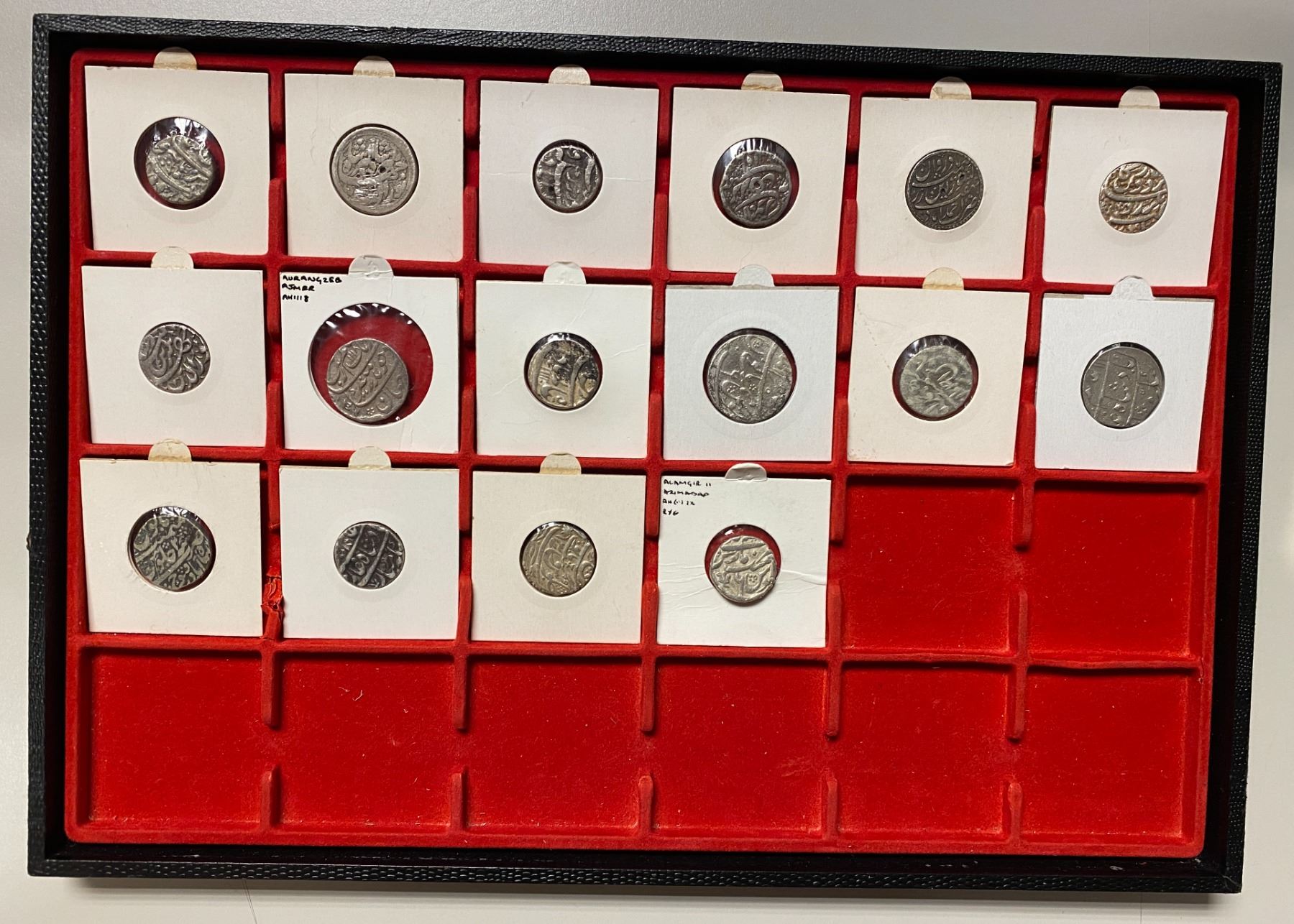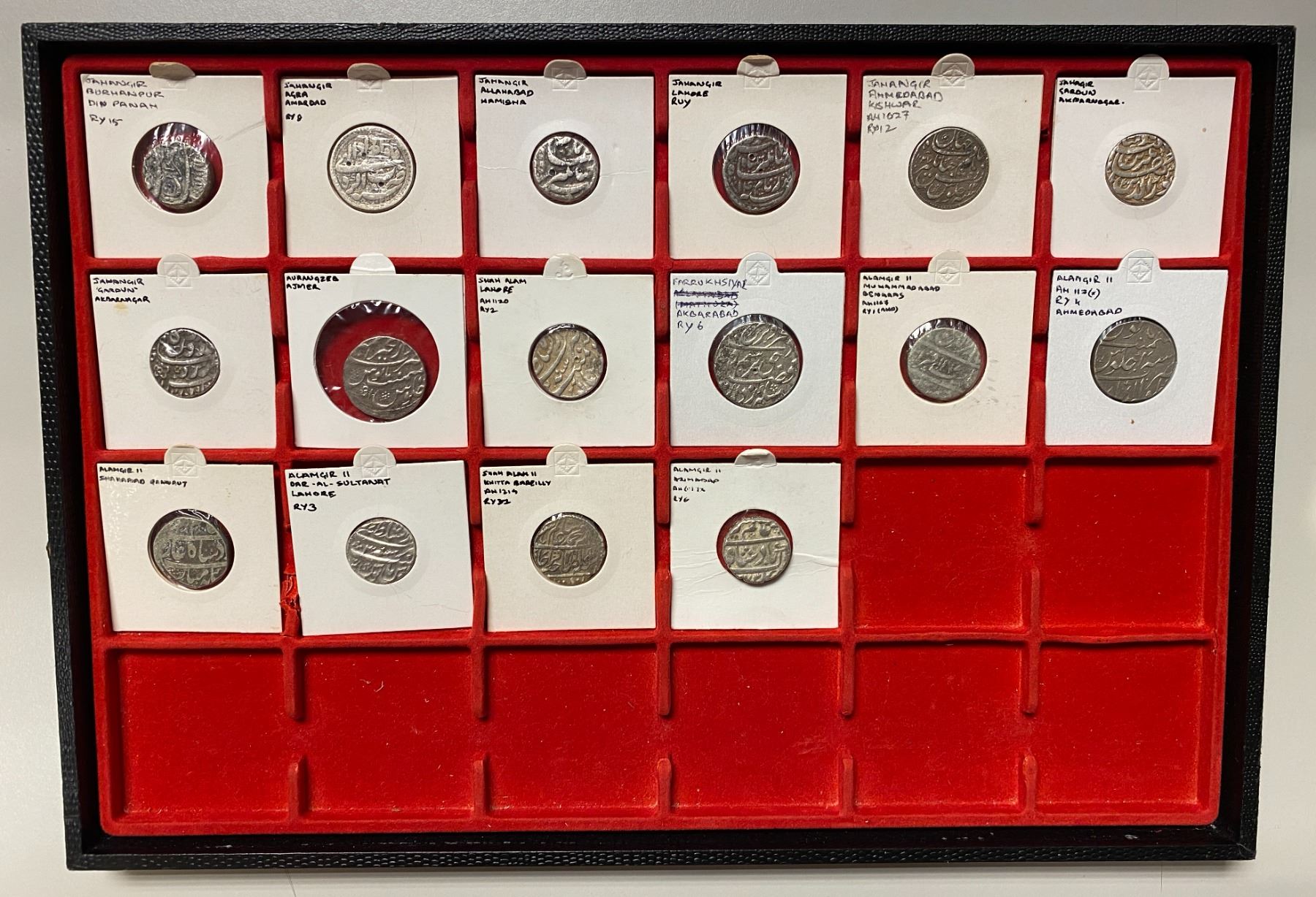 MUGHAL: LOT of 16 silver rupees, including Jahangir (Burhanpur, Allahabad, Agra, Lahore, Ahmadabad, and two of Akbarnagar); Aurangzeb (1, Ajmer); Shah Alam Bahadur (1, Lahore); Farrukhsiyar (1, Akbarabad); Alamgir II (5, Benares, Ahmadabad, Shahabad Qanauj, Azimabad, and Lahore); and Shah Alam II (1, Bareily); average Fine condition, buit all with testmarks, adhesions, or other noticeable defects; retail value $350; lot of 16 pieces.