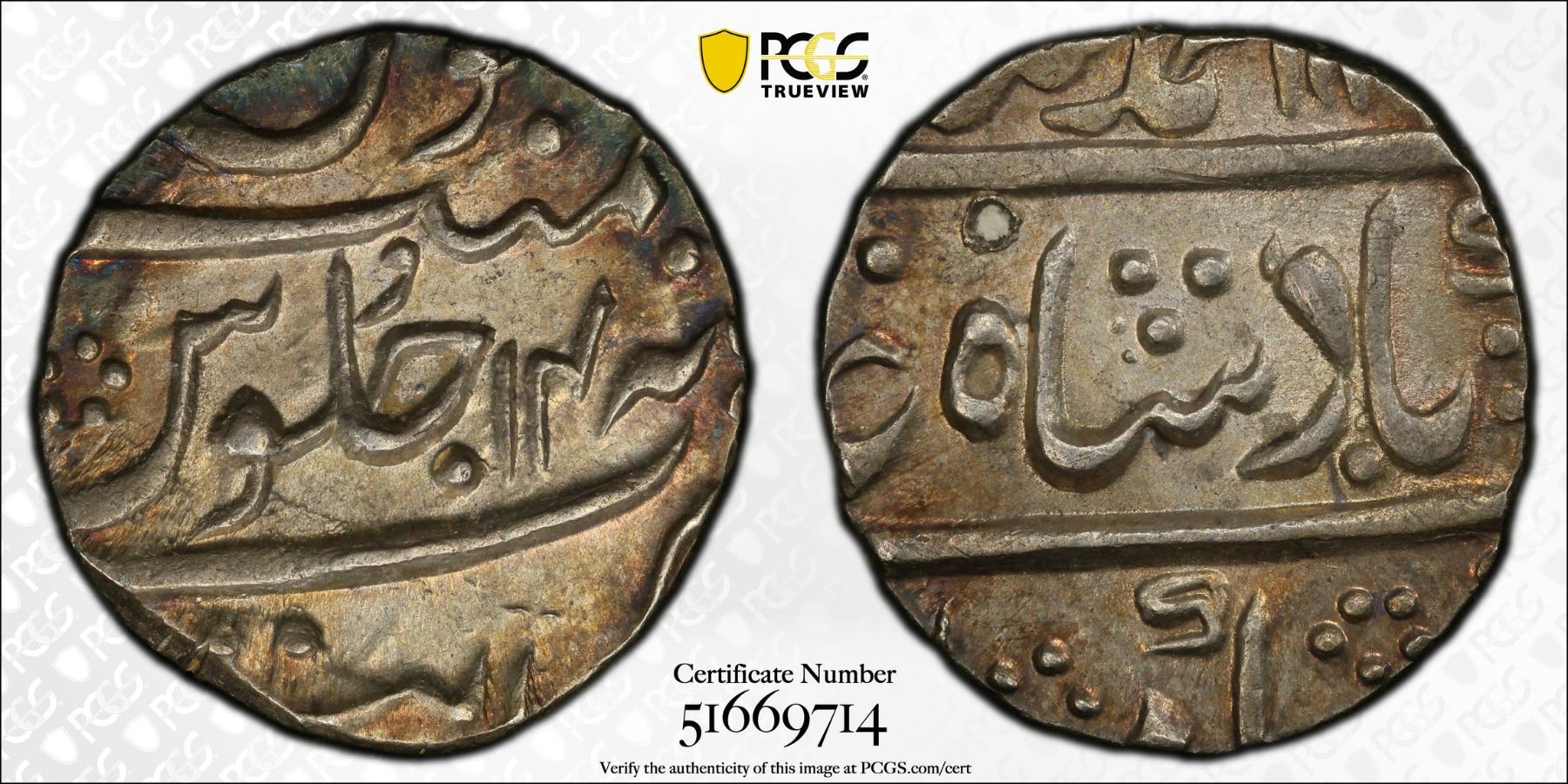 MUGHAL: Muhammad Shah, 1719-1748, AR 1/2 rupee (5.77g), Kambayat, year 14, KM-433.3, damage, lustrous fields, PCGS graded Unc details.