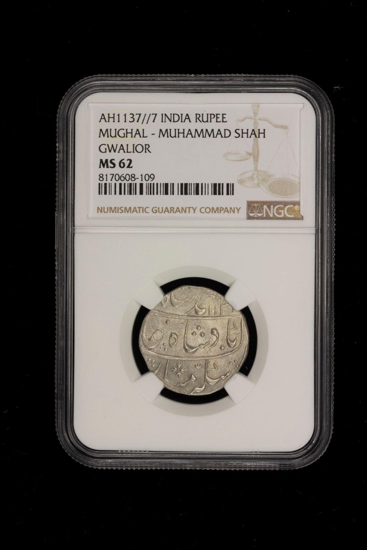MUGHAL: Muhammad Shah, 1719-1748, AR rupee, Gwalior, AH1137 year 7, KM-436.25, NGC graded MS62.