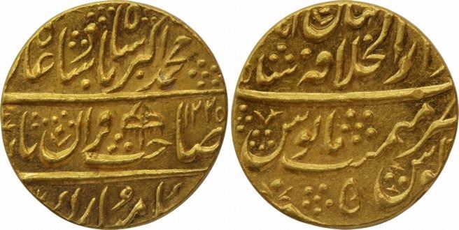 Muhammad Akbar II, Gold Mohur, 10.72g, "Sahib Qiran" couplet, Dar ul Khilafat Shahjahanabad Mint, AH 1225/ RY 5, Parsol on obverse (KM# 781). Complete legend on both sides. Extremely fine, very rare.