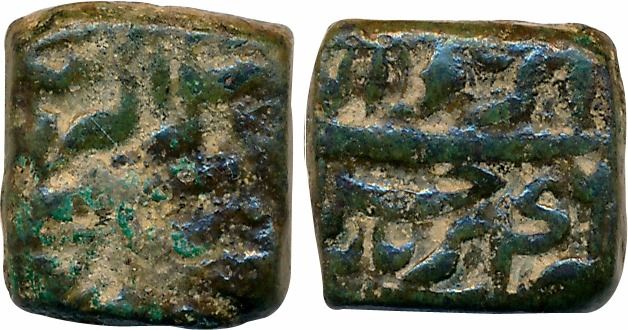 Akbar, Copper, Square, 6.75g, Burhanpur Mint, Ilahi Month Azar, Year 46, Obv: Tanka Akbar Shah XXXX hissa, Rev: Ilahi Azar Jarb Burhanpur jalal 46. Uncleaned, very fine, scarce.