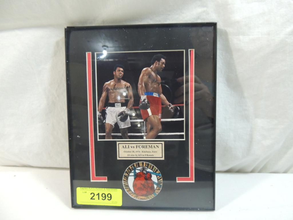 MUHAMMAD ALI AUTOGRAPHED FRAMED PHOTO. ALI VS FOREMAN. OCTOBER 30, 1974 KINSHASA, ZAIRE ALI WINS KO IN 8 ROUNDS. AUTOGRAPHED PHOTO FRAMED COLLECTIBLE. BOXING MEMORABILIA. AS SHOWN SEE PHOTO FOR MORE DETAILS.