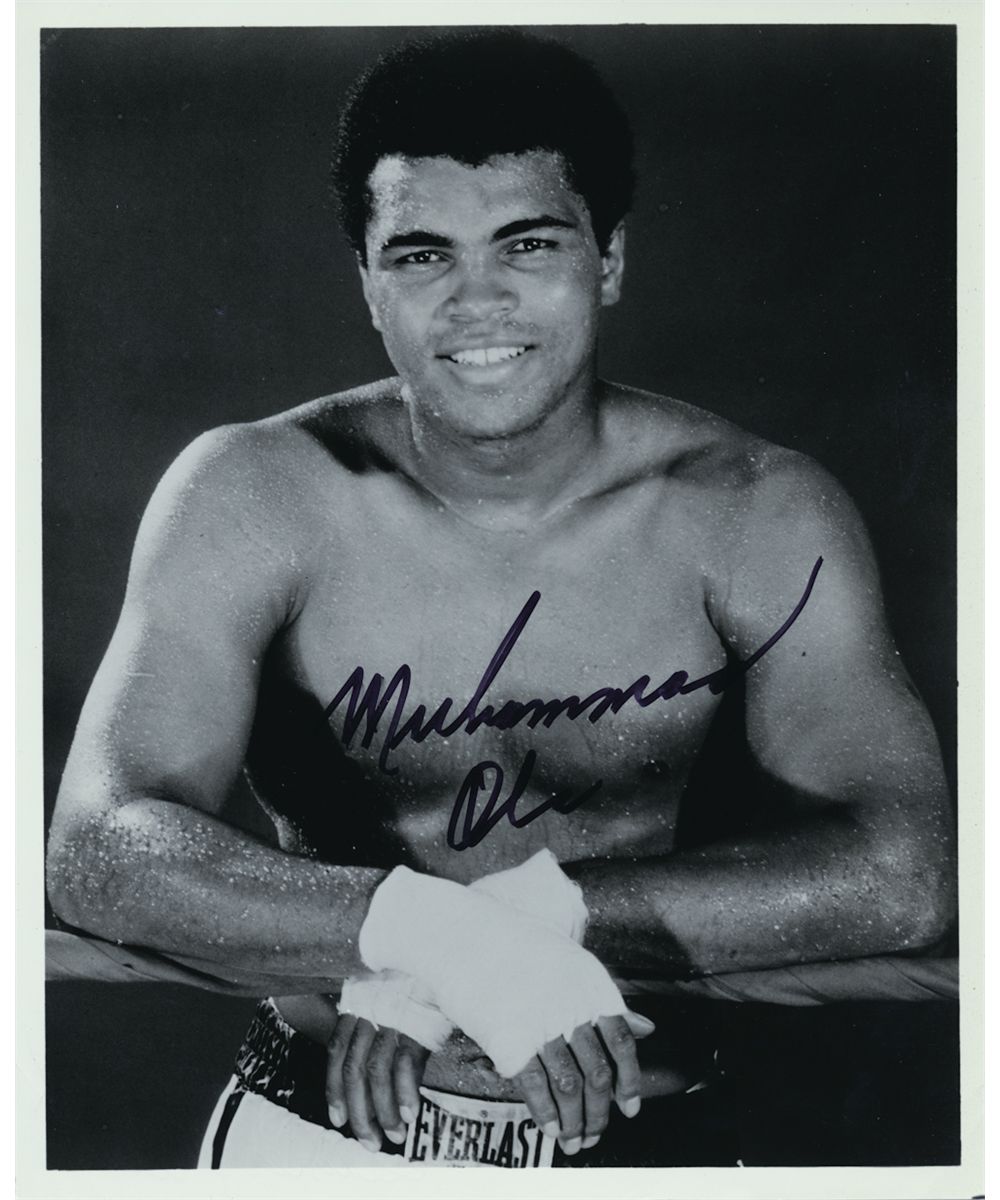 (b. 1942) American boxer and three time heavyweight champion, stripped of his title for refusing military service. A superlative Ali signed photo "Muhammad Ali", 8" x 10" b/w, a vintage ca. 1970 pose of the champion leaning on the ropes and smiling at the camera, boldly signed in black marker. On the verso, the piece is also signed in blue ballpoint: "From Wali Muhammad Trainer of Ali". Fine condition. Sold with four 3 1/2" x 5" color photos, apparently taken in Manila, one showing Ali in a white robe, one with Wali's daughter (and captioned so on verso), a candid of Imelda Marcos, and a shot of two ladies. WALI "BLOOD" MUHAMMAD (1927-2012) was one of Ali's trainers and worked in his corner from the first Ali-Frazier fight, on. Previously, he had worked for Sugar Ray Robinson starting in 1948 until gaining employment with Ali in 1965. He died in 2012 on Ali's 70th birthday. An excellent association!