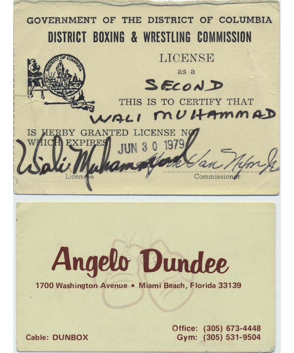 WALI "BLOOD" MUHAMMAD (1927-2012) was one of Ali's trainers who worked in his corner from the first Ali-Frazier fight, on. Previously, he had worked for Sugar Ray Robinson starting in 1948 until gaining employment with Ali in 1965. He died in 2012 on Ali's 70th birthday. Partly-printed D.S., 3 1/2" x 2 1/2", Muhammad's "License as a Second" issued by the District of Columbia and boldly signed by him at bottom. Undated but indicates that it would expire on June 30, 1979. Fine condition. Its purpose is unknown, although it may have been used for a boxing exhibition. Sold with: an 8" x 10" photo showing Wali tying-on Ali's gloves. WITH: the personal business card of Ali's chief trainer ANGELO DUNDEE giving his address, office and gym telephone numbers, and featuring on the verso a full-length photo of Dundee and Ali standing side-by-side. Very good. From Muhammad's estate.