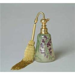 Lot 1263 MULLER CAMEO & ENAMELED ATOMIZER. Muller atomizer has cameo leaves, flowers and vines which are enameled green on leaves and purple on flowers, all against a yellow-green background. Signed with green enamel "Muller Frs Luneville". Gold colored atomizer top is marked "Made in France". SIZE: 6-1/2" t. CONDITION: Gold braided ball stem cover has come loose from atomizer top, otherwise very good. 5-70019 (400-600)