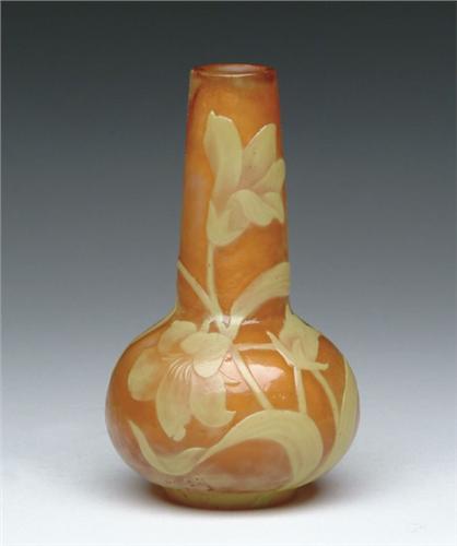 MULLER WHEELCARVED VASE. Beautiful cameo vase has yellow wheelcarved flowers, stems and leaves against a tangerine background. Signed on the underside with engraved signature "D. Muller Croismare Nancy". SIZE: 4-1/2 in. t. CONDITION: Very good to excellent. 5-61314