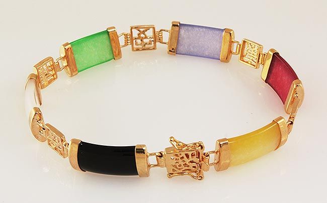MULTI-COLOR 9.65CTW JADE GOLD PLATED SILVER BRACELET **|**|** 7.5 INCHES MULTI-COLOR JADE 18K GOLD PLATED SILVER BRACELET ; MSRP: $100
