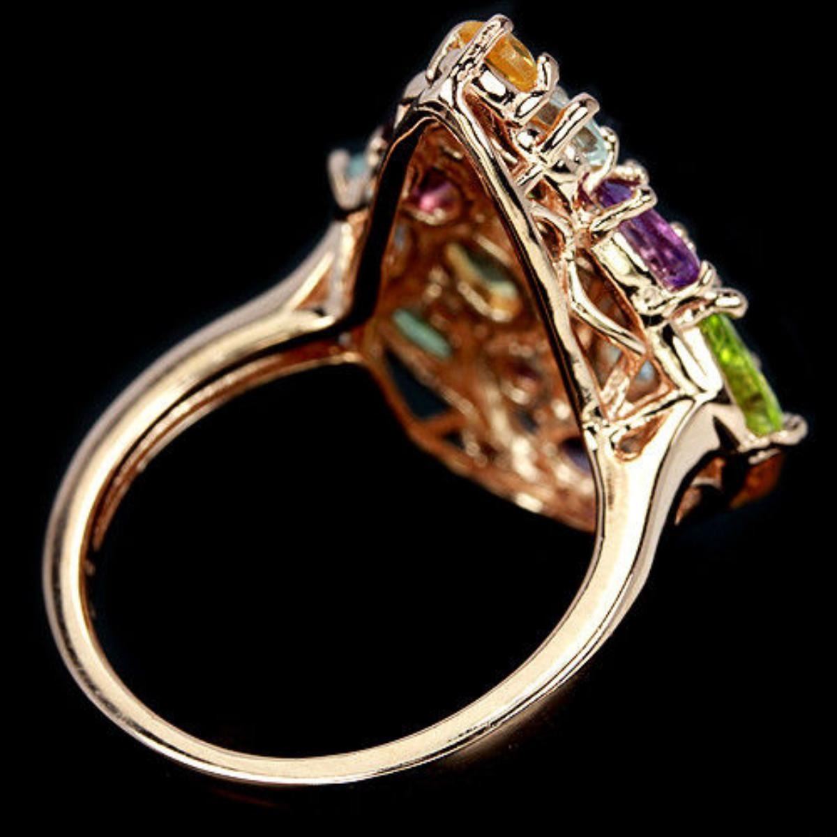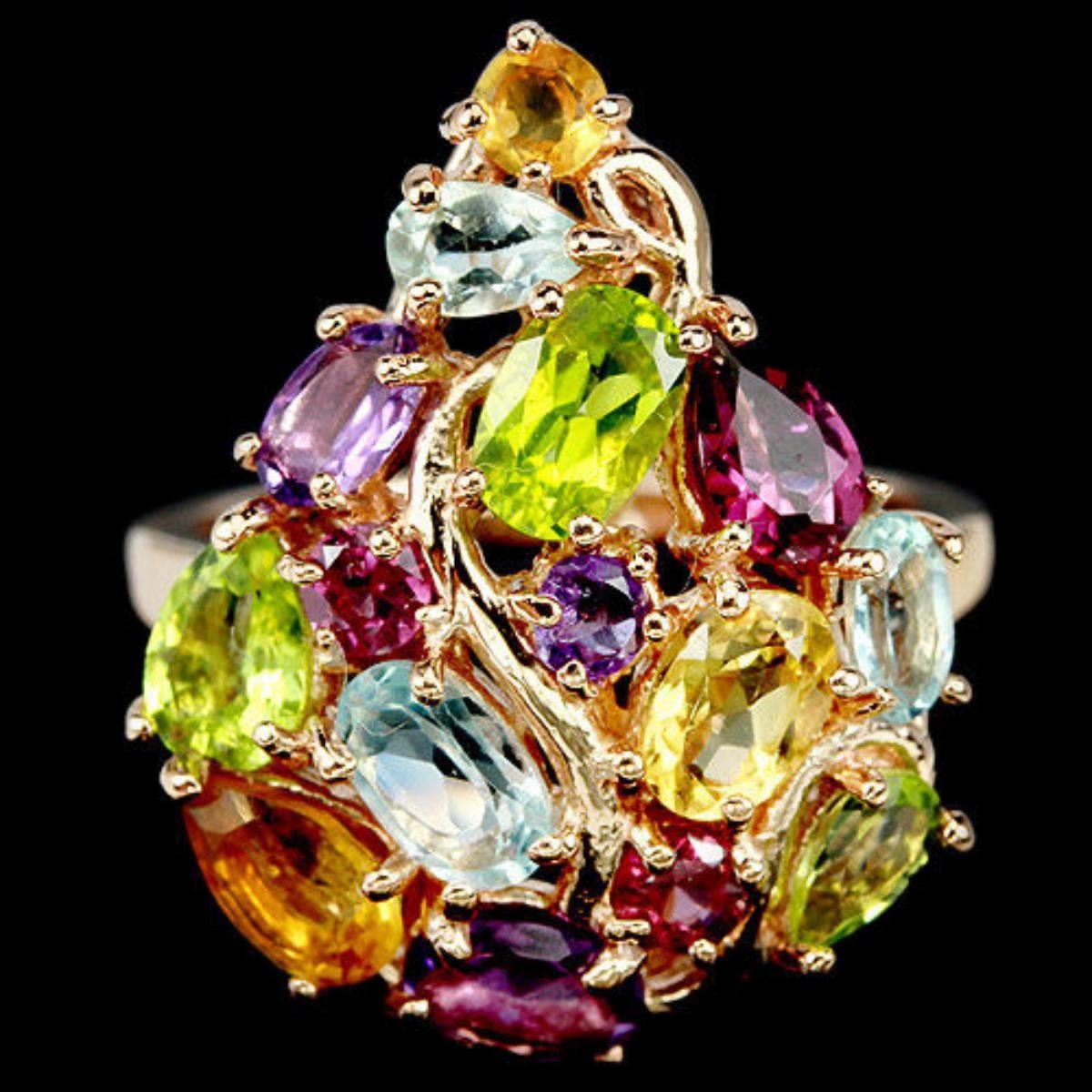 GENUINE TOPAZ RHODOLITE CITRINE PERIDOT 925 SILVER RING 14K PINK GOLD COATING;RING SIZE 8.00 ( can be resized ) ITEM QUANTITY 1 STONE SHAPE MIXED SHAPE STONE DIMENSION 6 X 4 MM. , 5 X 3 MM. 3 MM. ITEM WEIGHT 6.9 GRAM COLOR MULTI COLOR CLARITY IF - VVS LUSTER DAZZLING TREATMENT UNHEATED IRRADIATION ORIGIN OF STONE AFRICA, BRAZIL ASIA HARDNESS 6.5 - 8.0 FACE OF RING 25 X 20 MM.