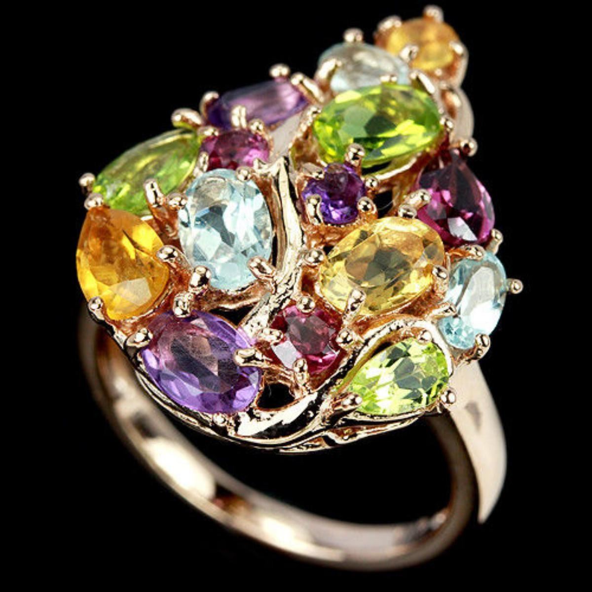 GENUINE TOPAZ RHODOLITE CITRINE PERIDOT 925 SILVER RING 14K PINK GOLD COATING;RING SIZE 8.00 ( can be resized ) ITEM QUANTITY 1 STONE SHAPE MIXED SHAPE STONE DIMENSION 6 X 4 MM. , 5 X 3 MM. 3 MM. ITEM WEIGHT 6.9 GRAM COLOR MULTI COLOR CLARITY IF - VVS LUSTER DAZZLING TREATMENT UNHEATED IRRADIATION ORIGIN OF STONE AFRICA, BRAZIL ASIA HARDNESS 6.5 - 8.0 FACE OF RING 25 X 20 MM.