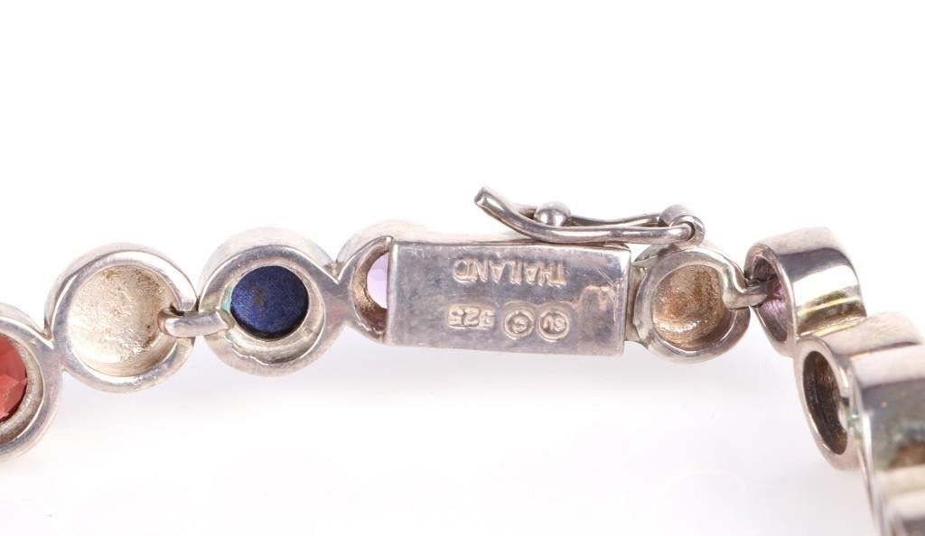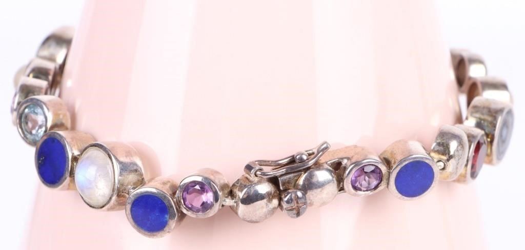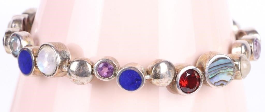 Multi-gemstone sterling silver ladies bracelet to include lapis, moonstone, cubic zirconium, abalone and more.