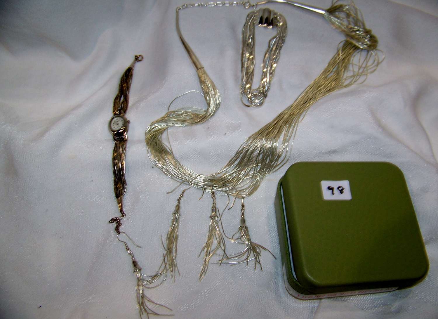 LOT INCLUDES (2) Pair liquid Silver dangle earrings. A liquid silver multi-strand necklace. A liquid silver multi-stranc=d St. marin quartz watch w/ mother of pearl dial. A Sterling Silver ten strand chain bracelet.