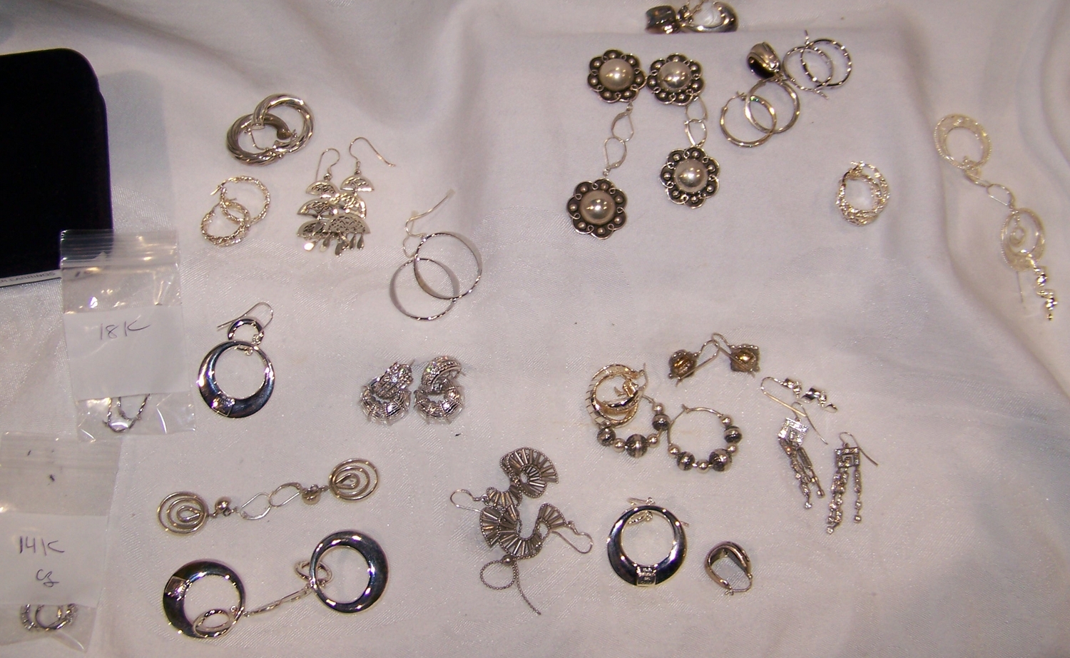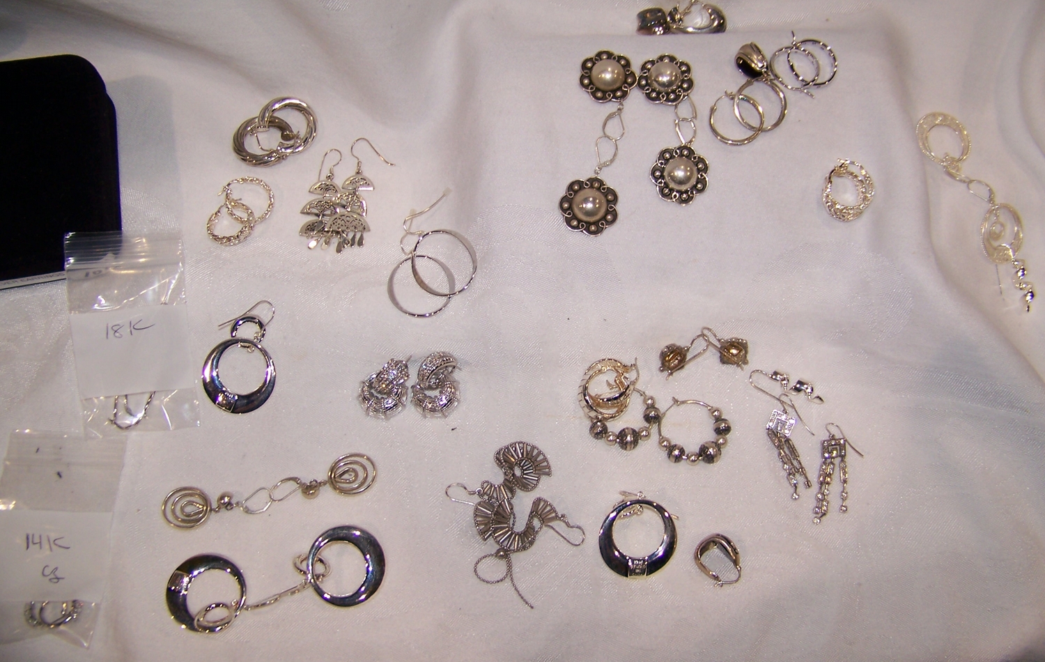 (17) PAIR OF STERLING SILVER HOOP & DANGLE EARRINGS. (3) PAIRS OF STERLING SILVER EARRINGS WEIGH 223.7 GRAMS. A PAIR OF 18K WHITE GOLD OVAL HOOP STYLE EARRINGS, THE EARRINGS WEIGH 2.3 GRAMS