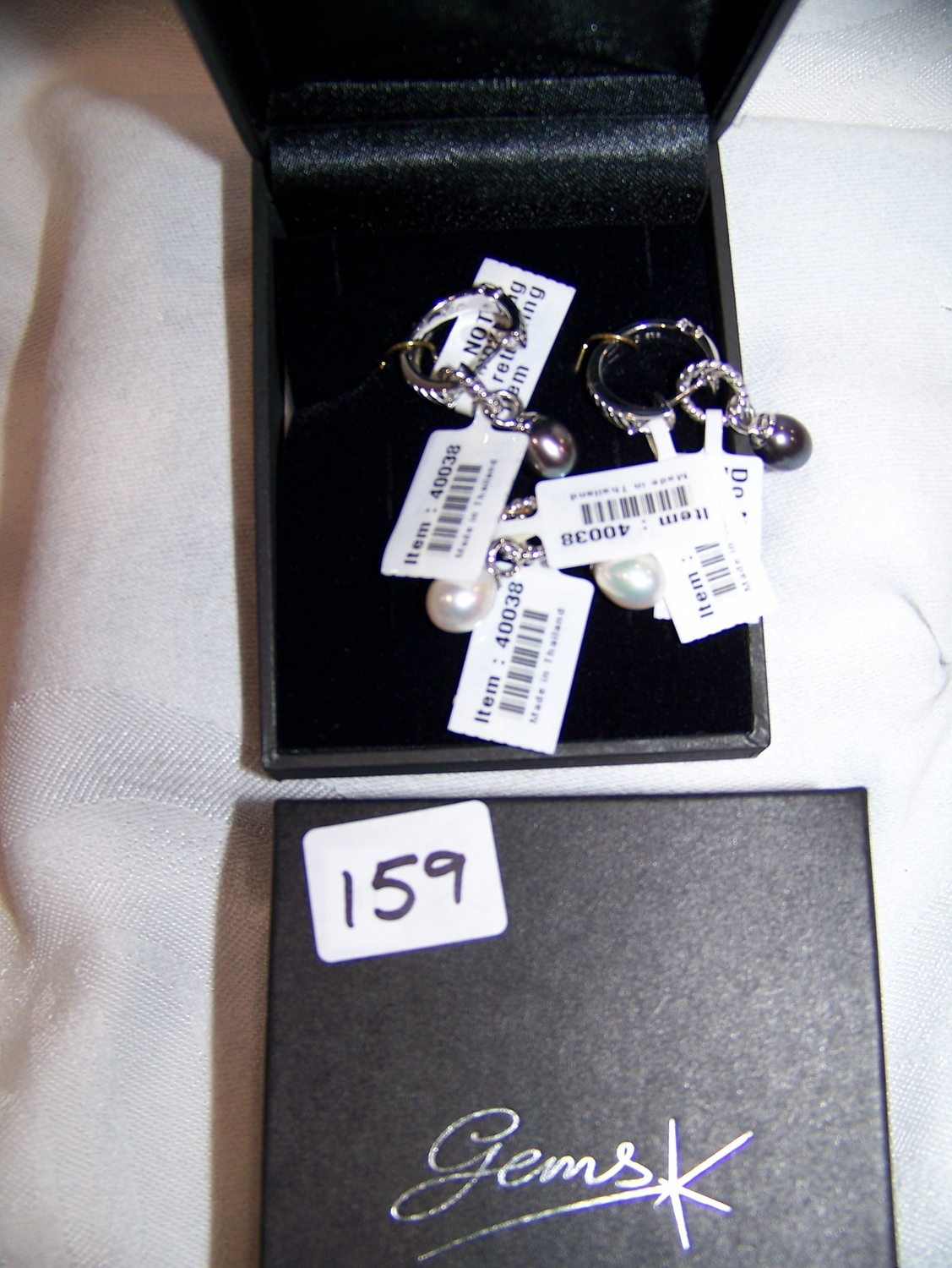 A PAIR OF STERLING SILVER HOOP EARRINGS W/ DROP EARRING PENDANTS SET W/ 2 BLACK FRESHWATER PEARLS (8X7.5 M.M) & W/ 2 EXTRA STERLING SILVER DROP EARRING PENDANTS SET W/ 2 FRESHWATER PEARLS 98X 7 M.M ) EARRINGS & PENDANTS WEIGH 11.2 GRAMS(Descriptions used with permission from a Fair Market Value Appraisal 2007)