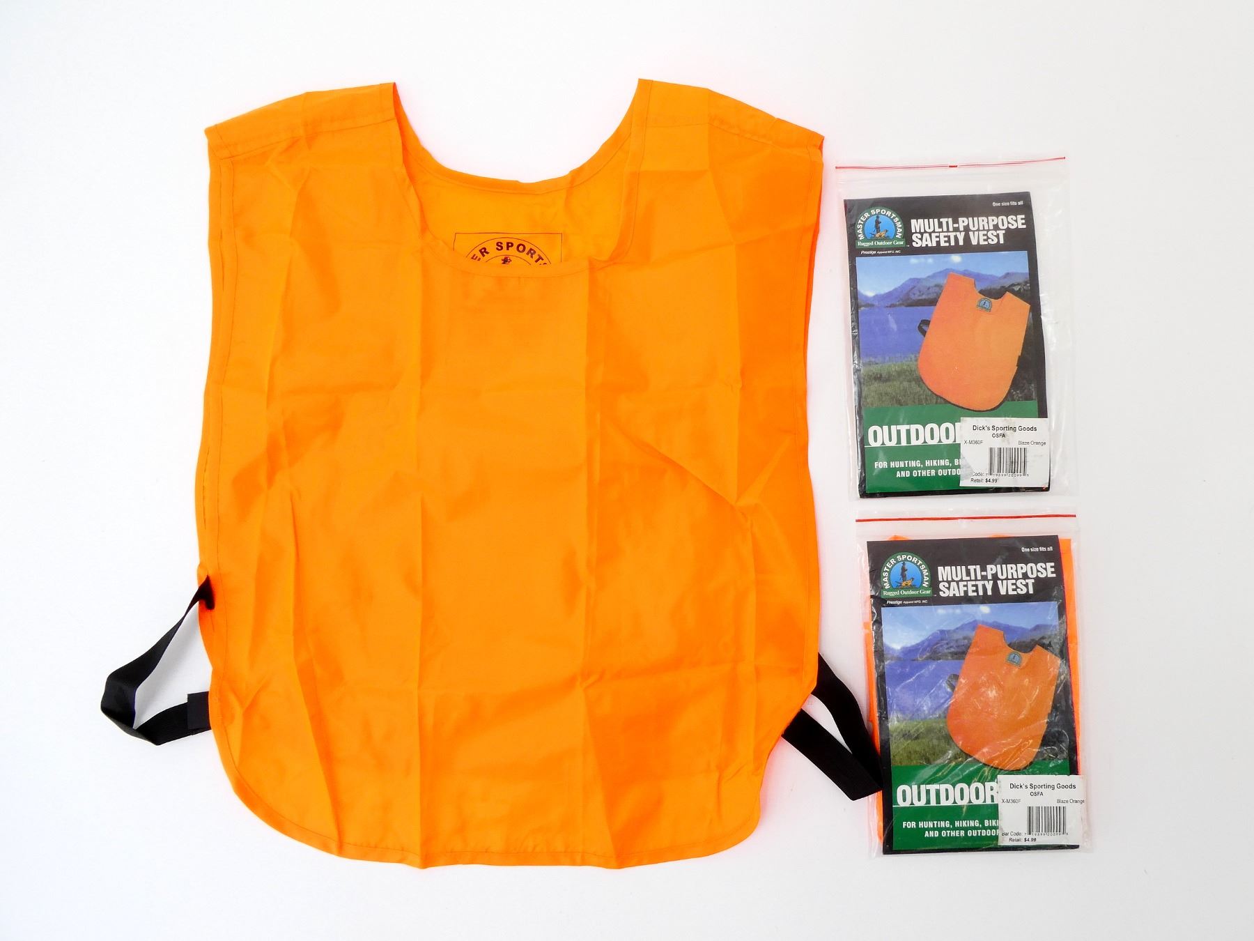 LOT INCLUDES; (2) MULTI-PURPOSE SAFETY VESTS, LABELLED DICK'S SPORTING GOODS OSFA, ONE SIZE FITS ALL, NOS, IN ORIGINAL PACKAGING. SEE PHOTOS.