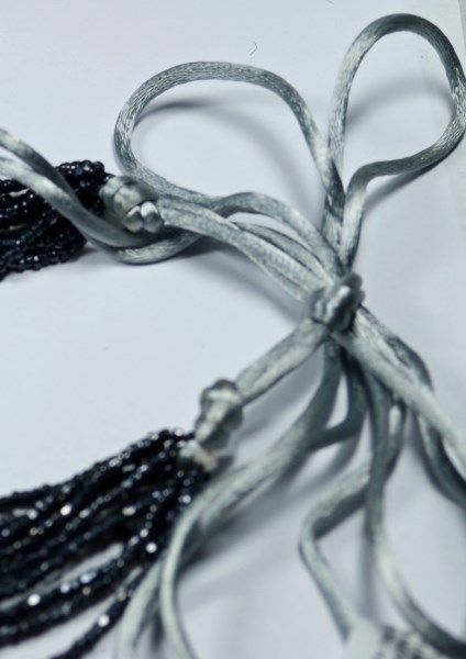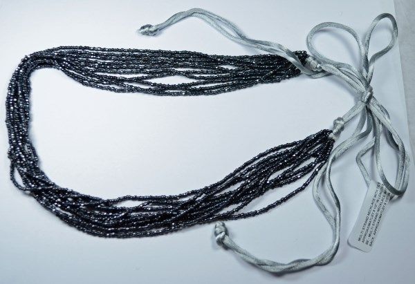MULTI STRAND NECKLACE WITH TIE BACK. APPROAXIMATLEY 9 1/2" IN LENGTH BUT CAN BE LENGTHENED A LITTLE.