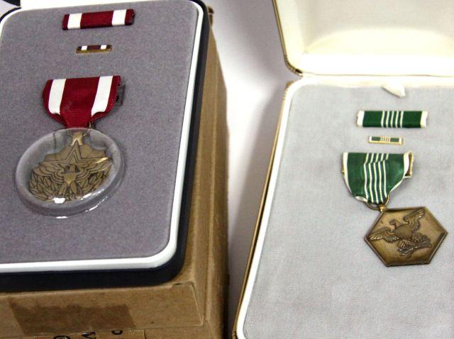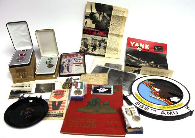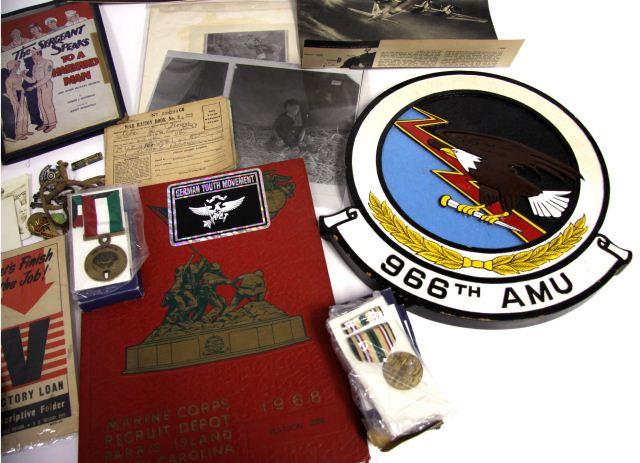 A very useful box lot of all military related items consisting of early Revolutionary war etching , early Naval ship postcards,1980's boxed U.S. Medals , meritorious service types, WW2 ephemera booklets and related items, WW1 AEF veterans ring, WW1 dog tag, WWII DUI and more, a U.S. Air Force Squadron plaque 986th AMU, 1968 USMC Parris Island graduation year book, and more.