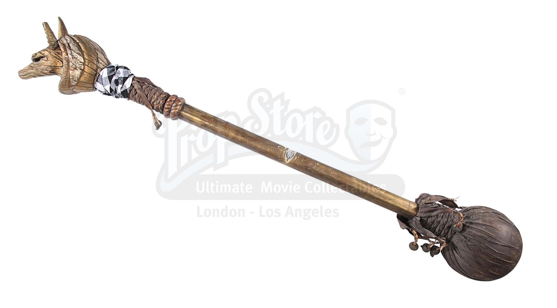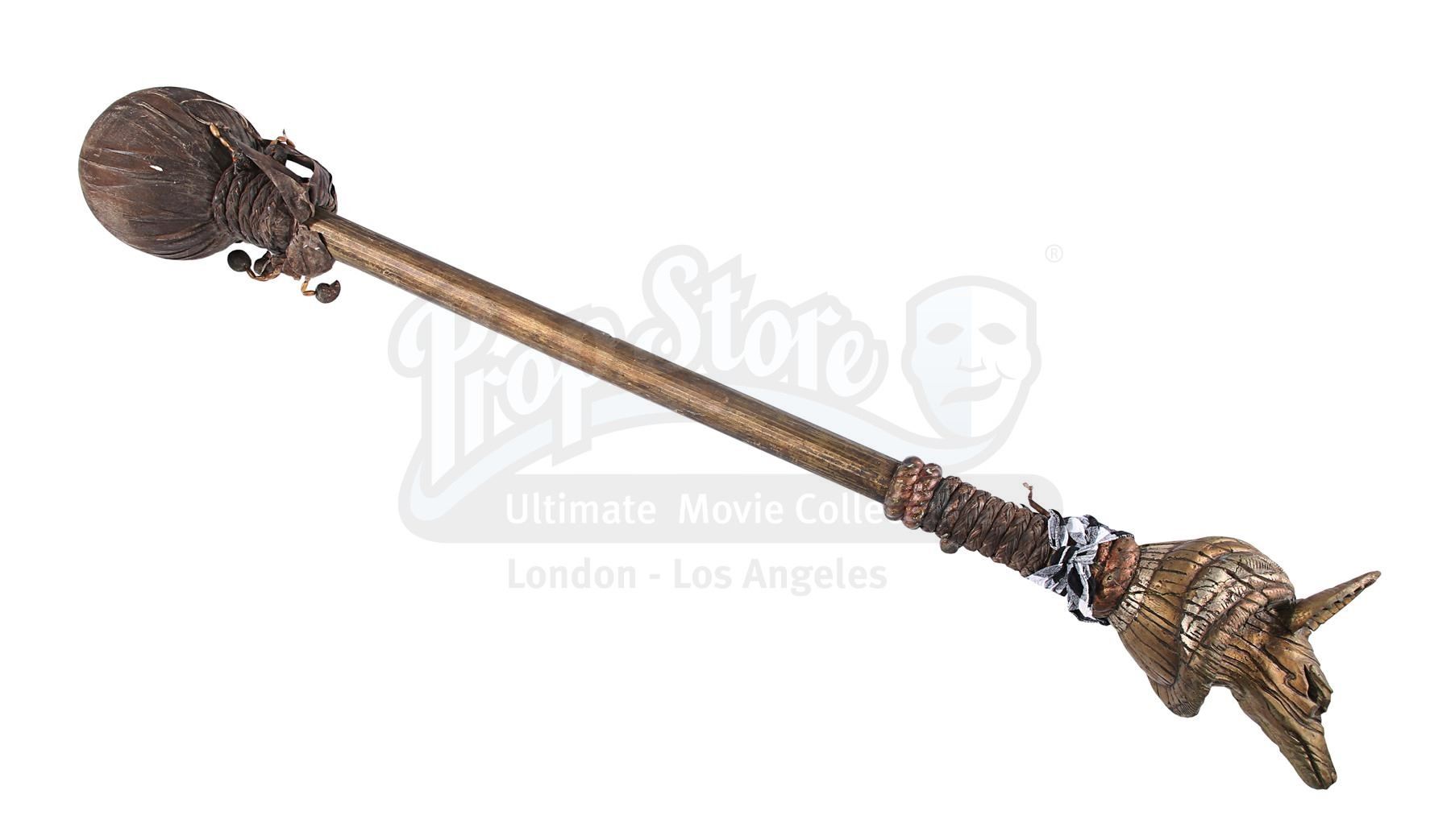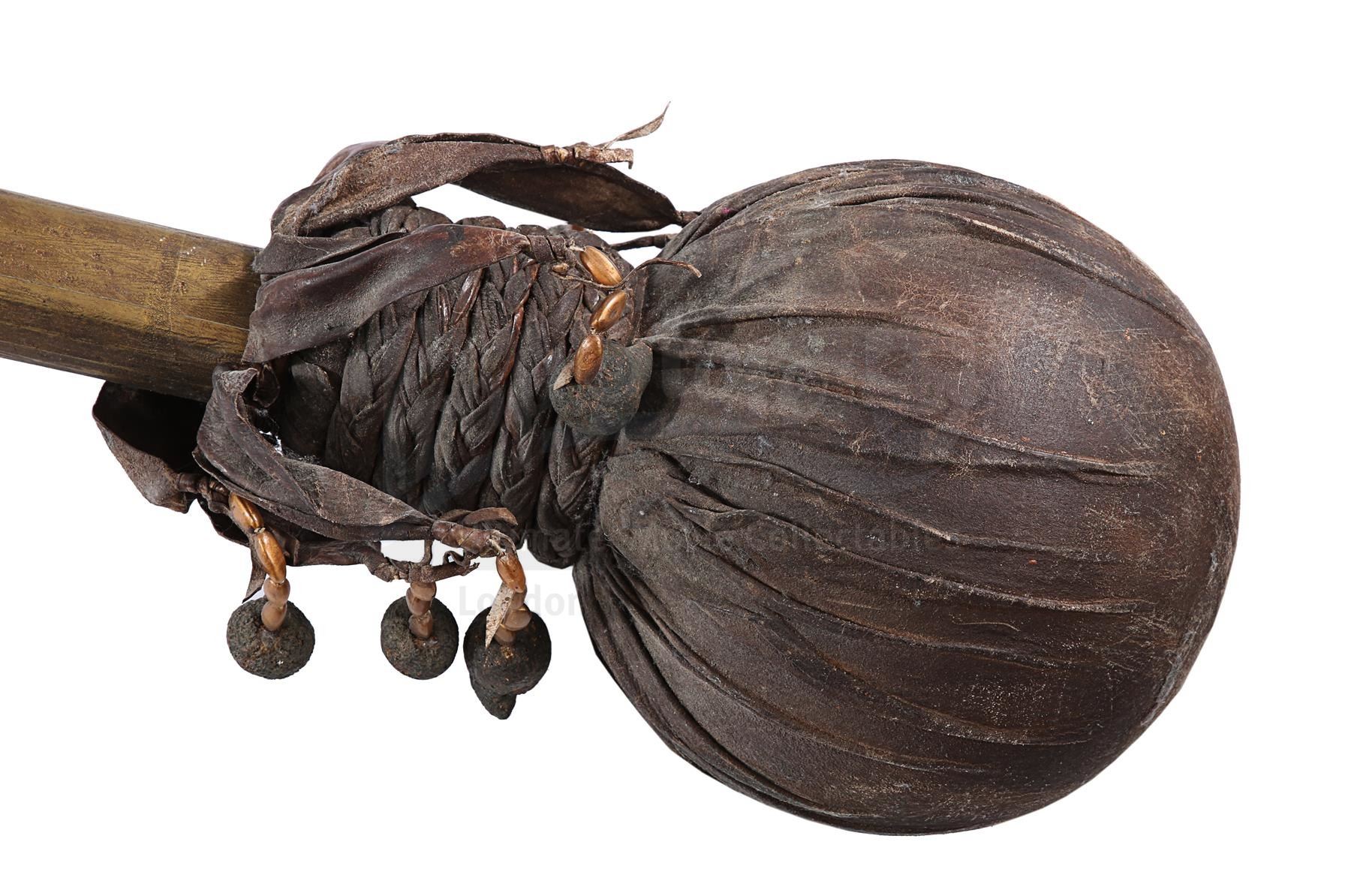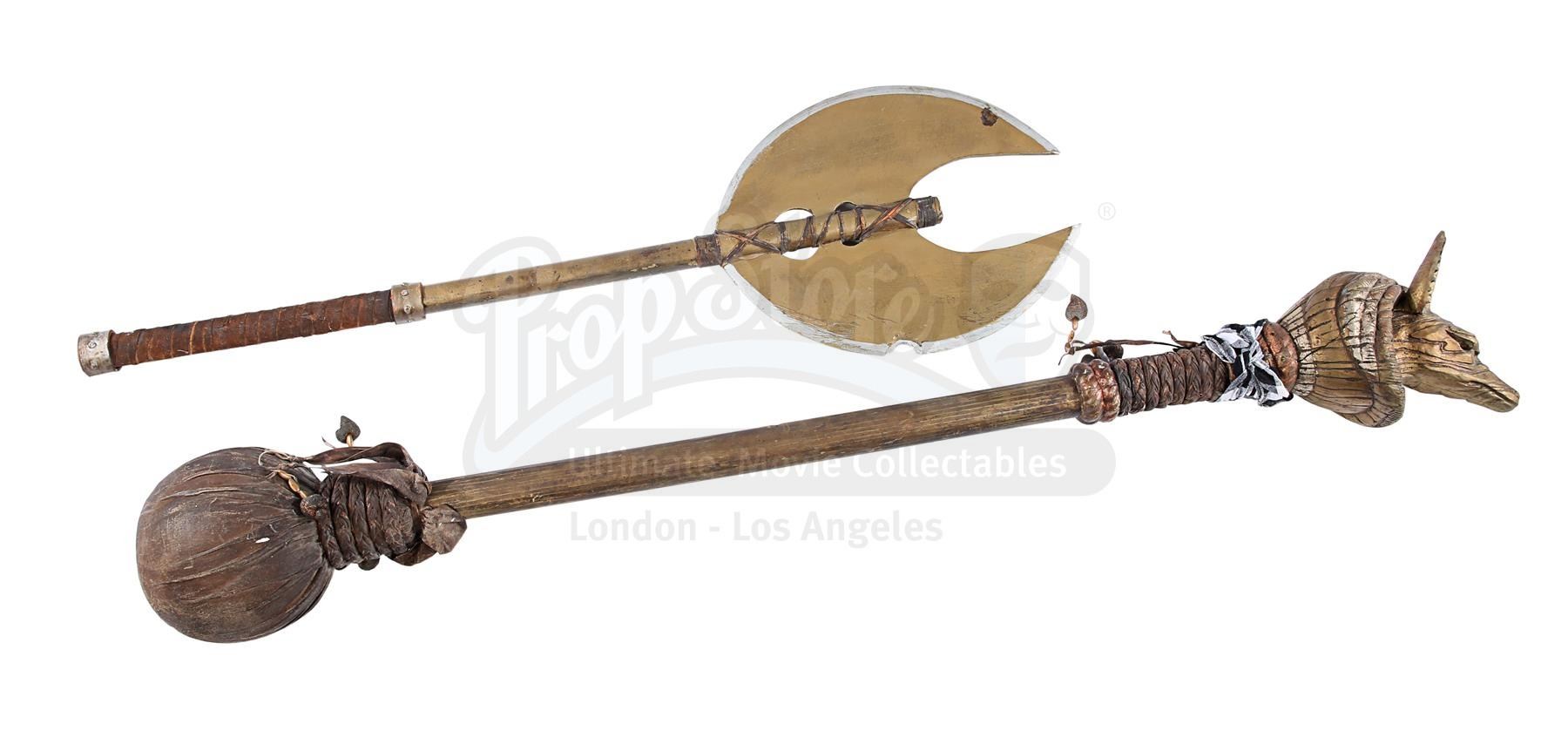 Rick O'Connell's (Brendan Fraser) double-bladed axe with Imotep's (Arnold Vosloo) gong mallet from Stephen Sommers' fantasy adventure sequel The Mummy Returns. Rick picked up his axe in the Scorpion King's (Dwayne Johnson) pyramid and used it to try and kill the monstrous warrior, but was foiled by Imhotep (Arnold Vosloo) using a gong mallet, before both weapons fell into the Underworld.
