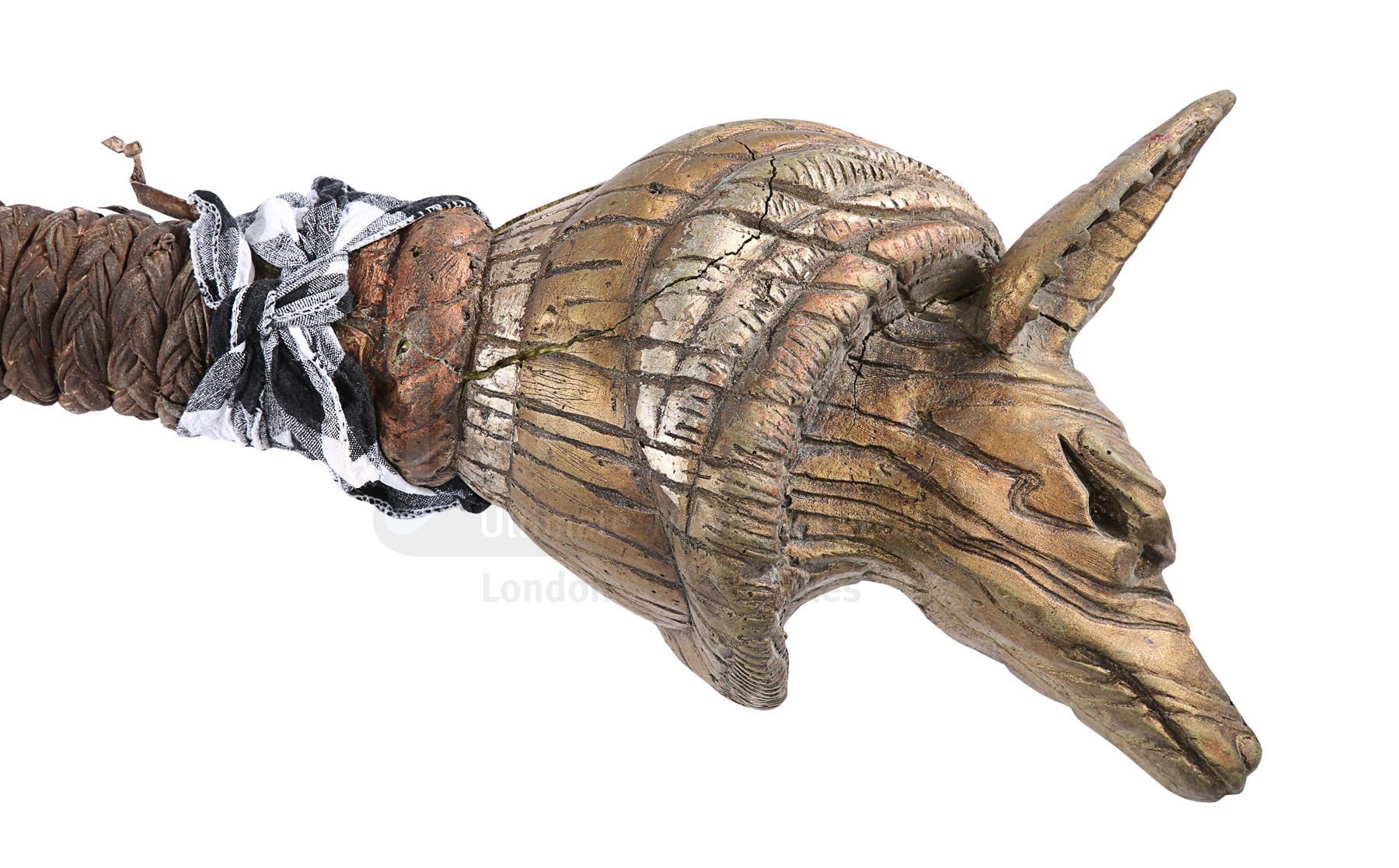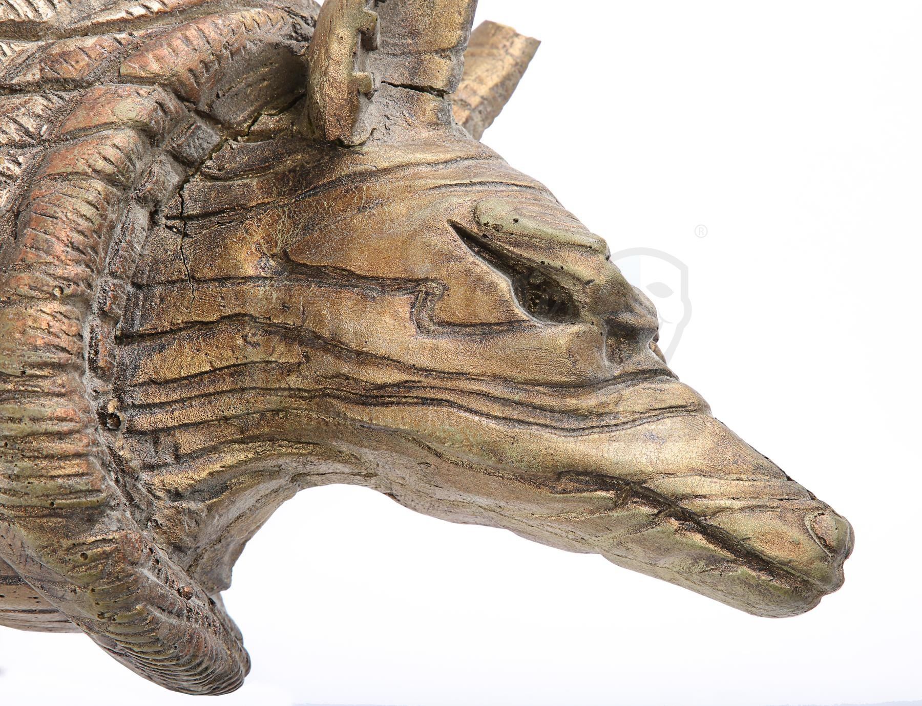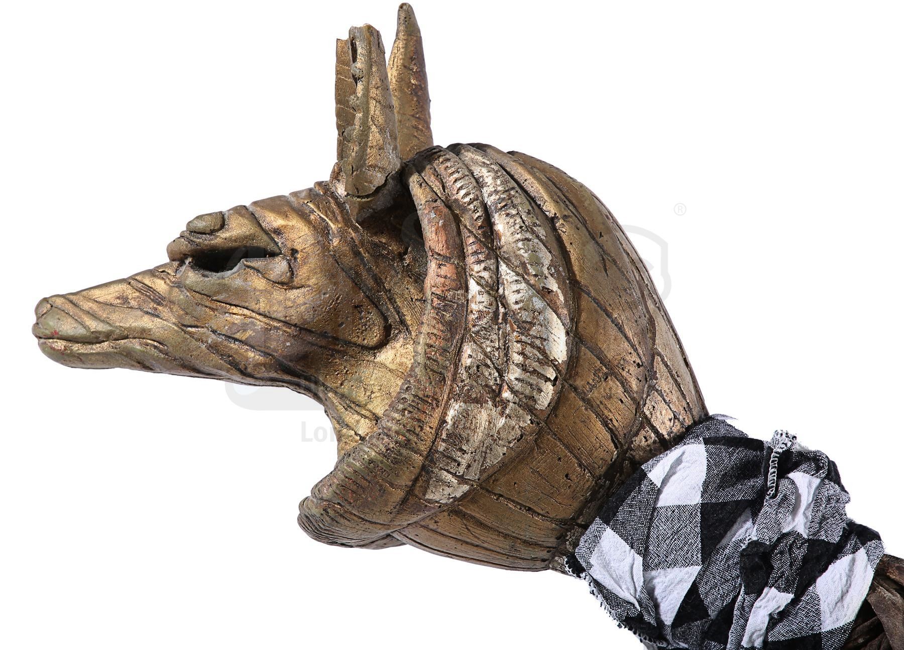 The axe has a wooden handle and metal blades, both of which are painted a golden colour. There is a semi-circular dent on one side of one blade, where the weapon struck the gong mallet wielded by Imhotep. There is a corresponding mark on the mallet, which is made predominantly of wood, with a metal rod running through the middle of the shaft. The mallet end is a ball of foam rubber wrapped in leather, and at the other end there is a Egyptian jackal head, also made of foam rubber with a metal armature, designed to look like wood.